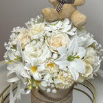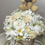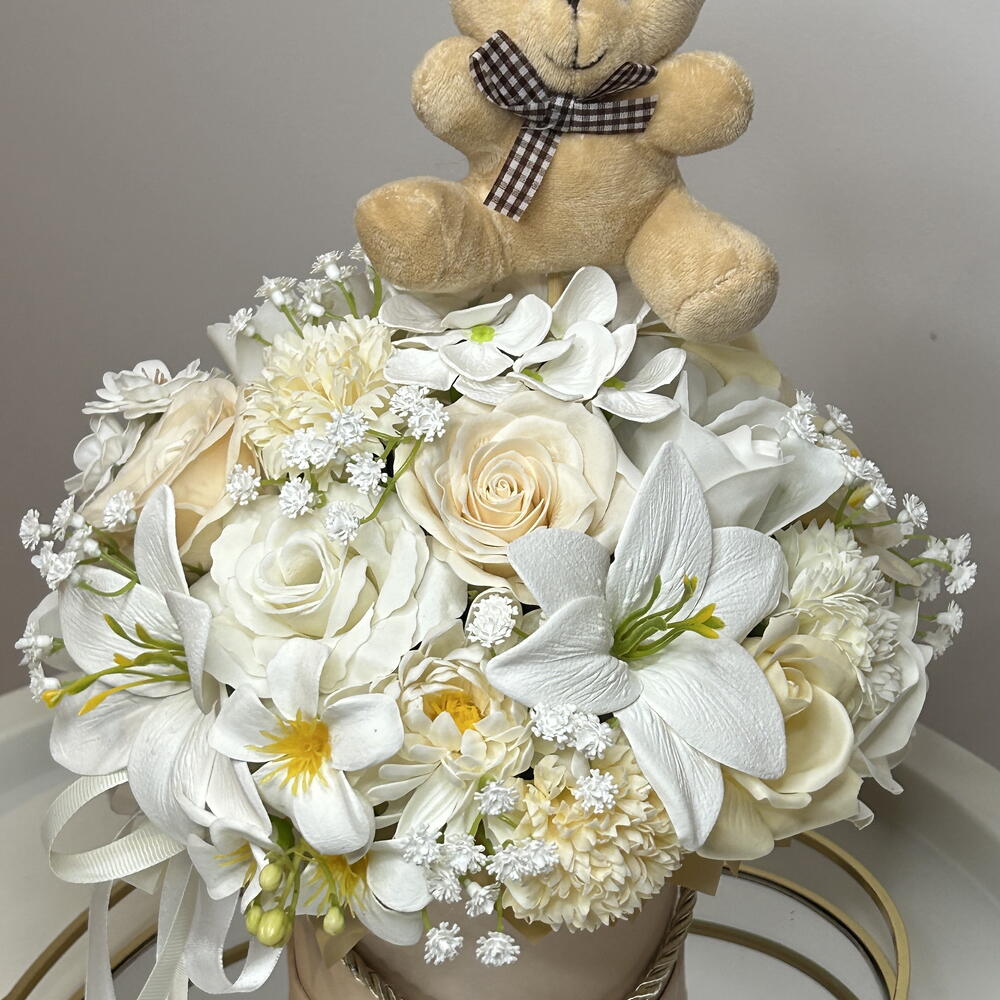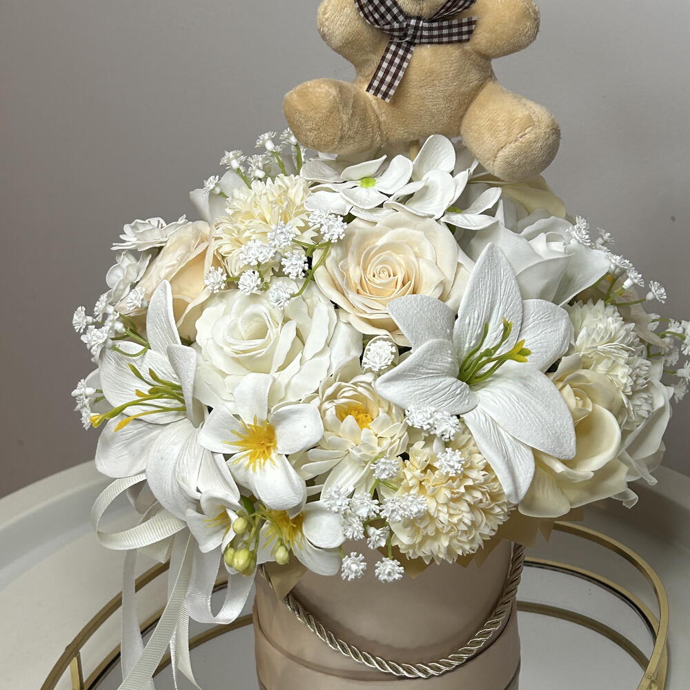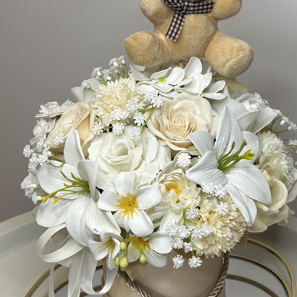 Bouquet soap flowers flower box teddy bear baby shower birthday birth of a child