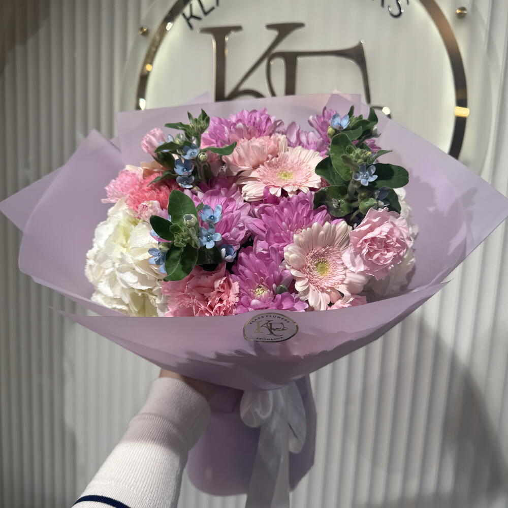 Gerbera - 5 pcs delphinium - 4 pcs hydrangea - 3 pcs chrysanthemum - 2 pcs carnation Dianthus - 5 pcs