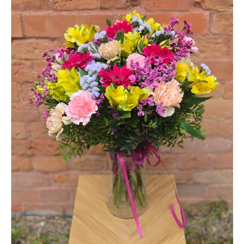 🌼 Summer Joy — an explosion of colors and positive energy contained in a bouquet! Dive into a kaleidoscope of sunny yellows, joyful pinks, delicate blues and juicy greens. This bouquet is the perfect choice to lift the mood, for birthdays, to say thank you, or simply just because — every moment can be a celebration! 🌈 Order now and give a little sunshine! Bouquet L consists of approx. 25 flowers