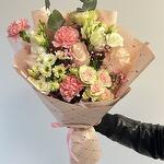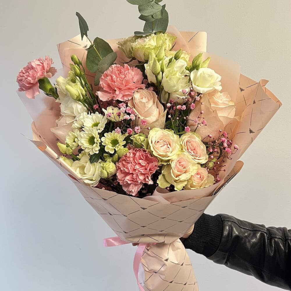 Eustoma - 2 pcs Pistacia - 3 pcs santini - 1 pcs baby's breath flowers - 1 pcs rose - 3 pcs spray rose - 2 pcs carnation - 3 pcs