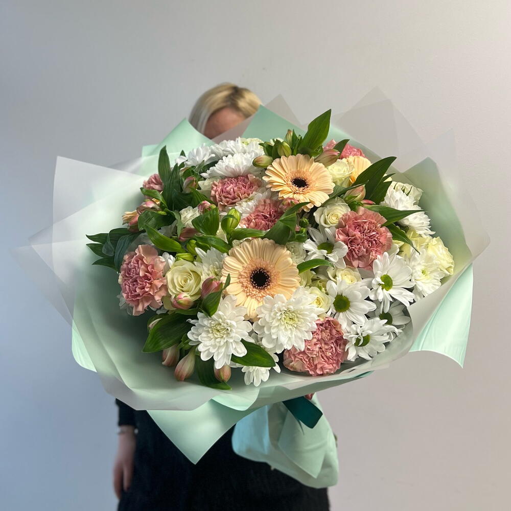 Gerbera - 4 pcs alstroemeria mix - 7 pcs rose - 7 pcs spray rose - 7 pcs carnation - 7 pcs white chrysanthemum - 7 pcs
