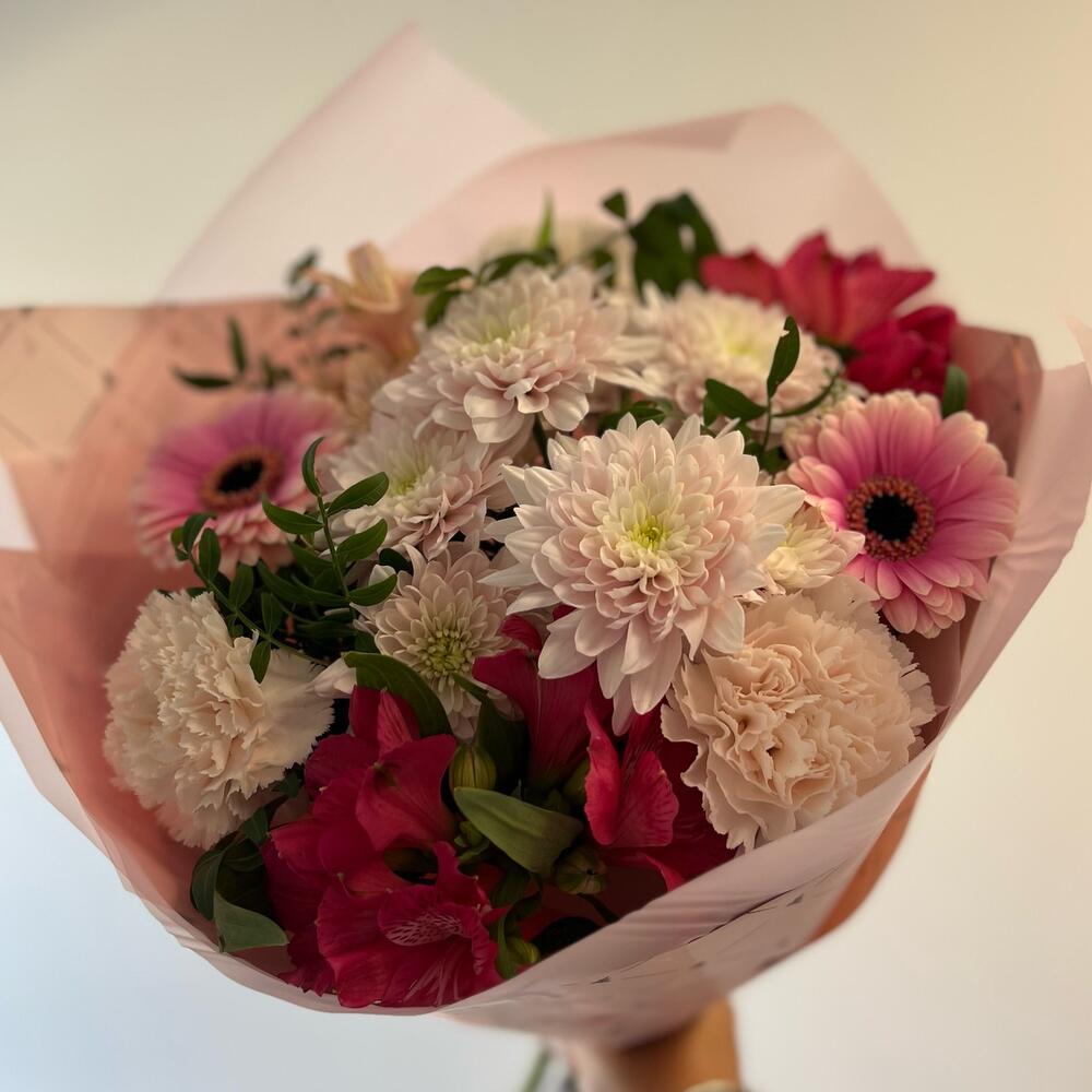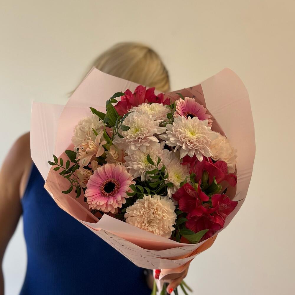 Gerbera - 2 pcs carnation - 3 pcs chrysanthemum - 1 pcs pistachios - 3 pcs alstroemeria mix - 3 pcs