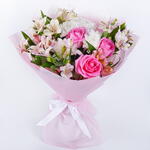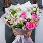 This bouquet is a radiant composition of spray chrysanthemums, alstroemerias and roses that will brighten even the gloomiest days. Spray chrysanthemums bring joy and lightness, alstroemerias add delicacy and elegance, and roses emphasize sophistication and classic charm. Together they create an exceptional arrangement that will surely impress. The bouquet is perfect for any occasion — from a romantic date to a professional event. It's the ideal gift for a loved one, a colleague, or a friend. Don't hesitate to bring joy to your loved ones!