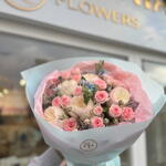 oxypetalum - 3 pcs limonium purple - 2 pcs roses - 5 pcs spray roses - 6 pcs