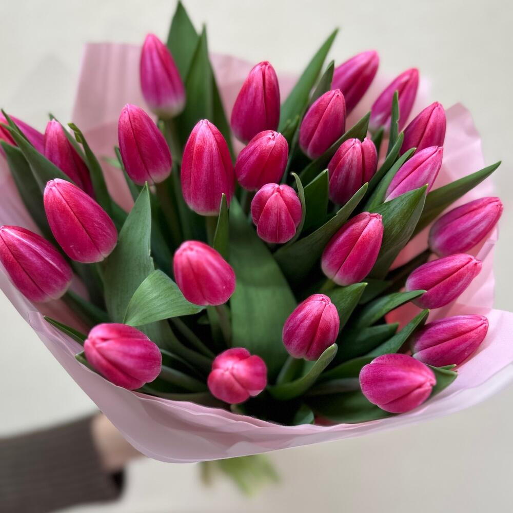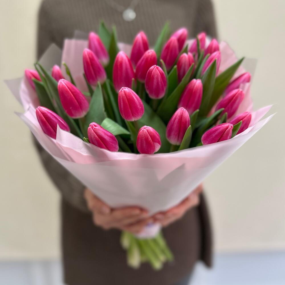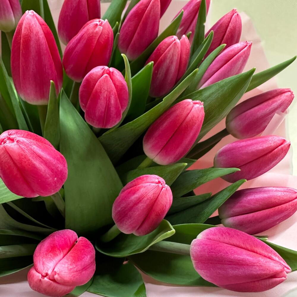 A charming bouquet of 25 pink tulips exudes elegance and subtle romance. A lush arrangement of fresh flowers creates a graceful, eye-catching display, carefully packaged to highlight the tulips' natural beauty. Perfect for birthdays, anniversaries, or simply to give someone a pleasant and joyful surprise.