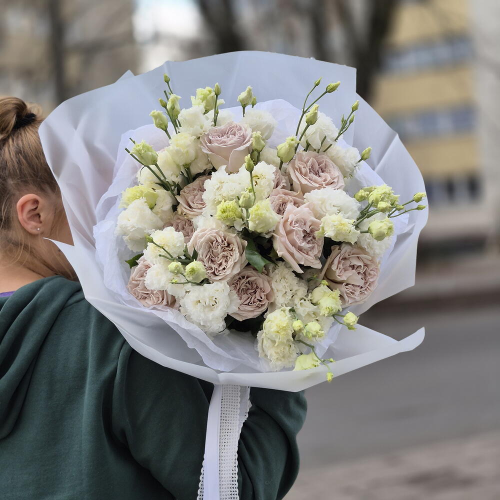 Skład: biała eustoma, róża Westminster Abbey, papier dekoracyjny