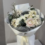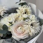 Elegant bouquet in a cream-white color palette with spider chrysanthemum, gerbera, ranunculus, dianthus and eucalyptus. A light, modern arrangement handcrafted from premium flowers, packaged in minimalist, light-colored wrapping.