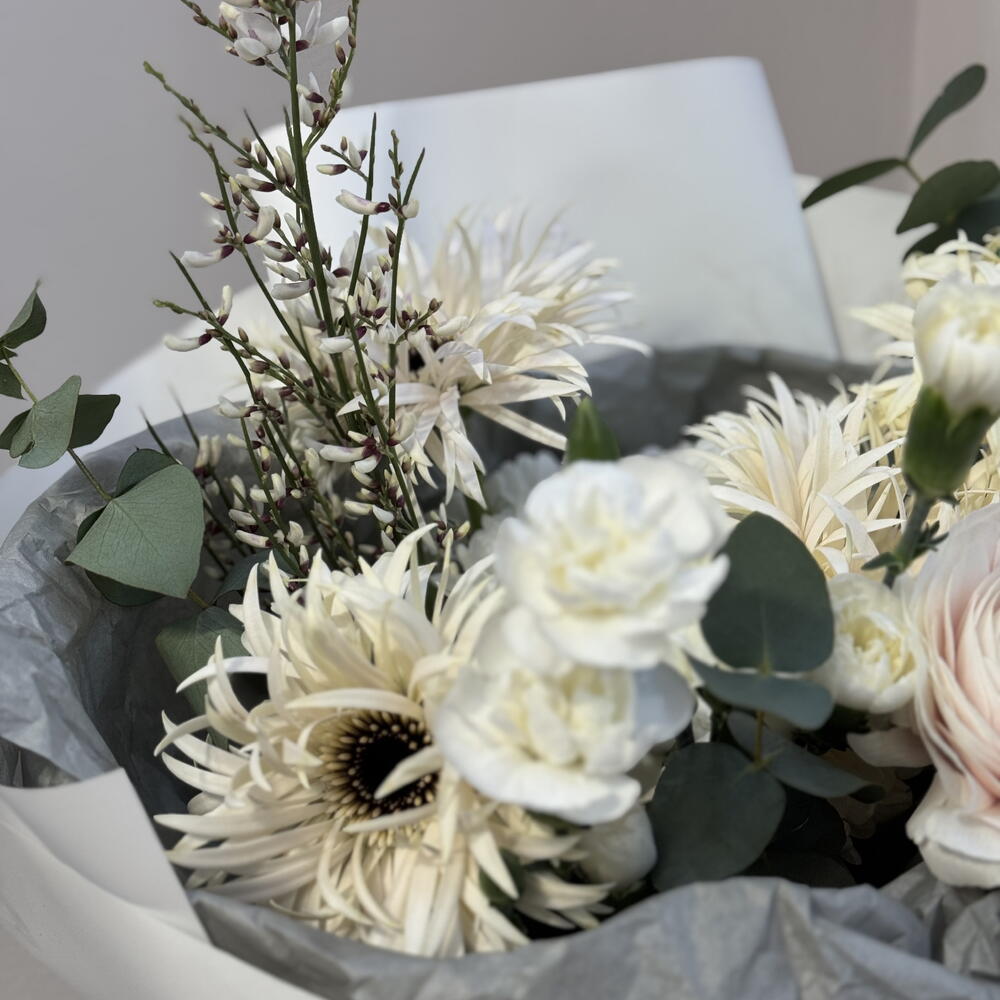 Elegant bouquet in a cream-white color palette with spider chrysanthemum, gerbera, ranunculus, dianthus and eucalyptus. A light, modern arrangement handcrafted from premium flowers, packaged in minimalist, light-colored wrapping.