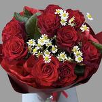 Bouquet of red roses and chamomile