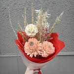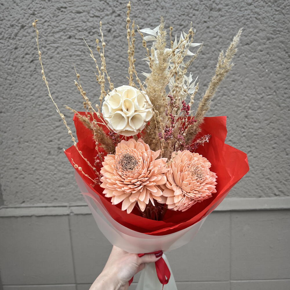 Limonium - 1 pcs Ruskus - 1 pcs lipidium - 1 pcs grass - 5 pcs decorative paper - 1 pcs flower - 3 pcs