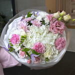 Clematis - 2 pcs santini - 2 pcs hydrangea - 1 pcs spray rose - 1 pcs carnation - 3 pcs chrysanthemum - 1 pcs freesia - 3 pcs