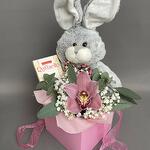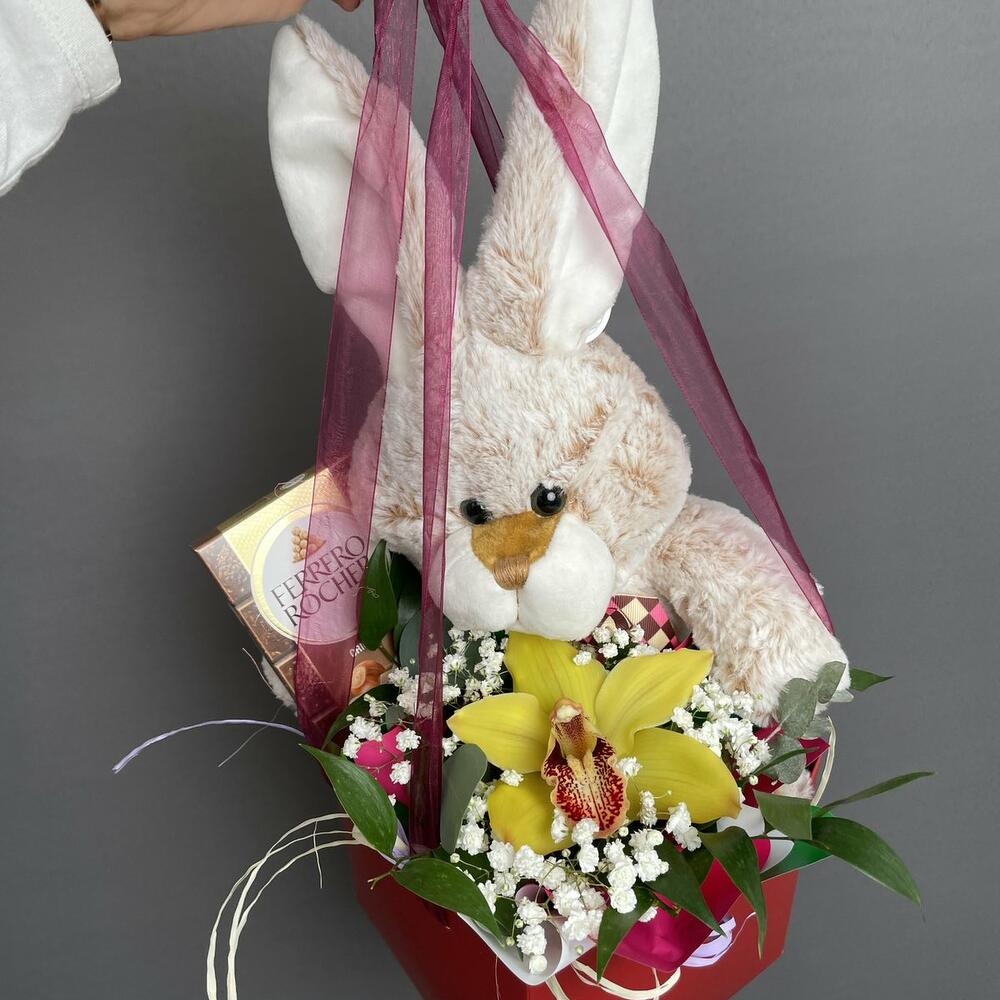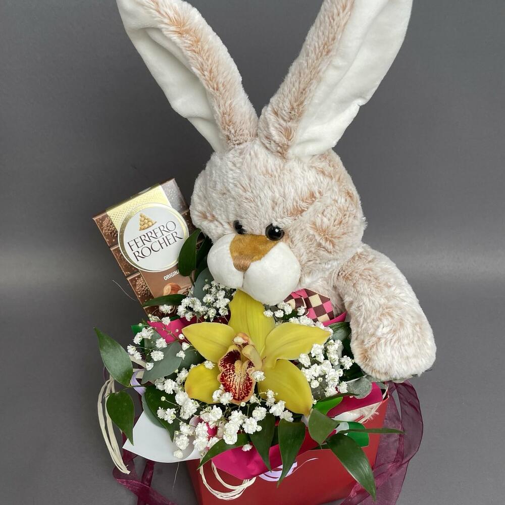 Box - 1 pcs cymbidium - 1 pcs green - 1 pcs bunny 30cm - 1 pcs 90g or raffaello chocolate - 1 pcs