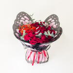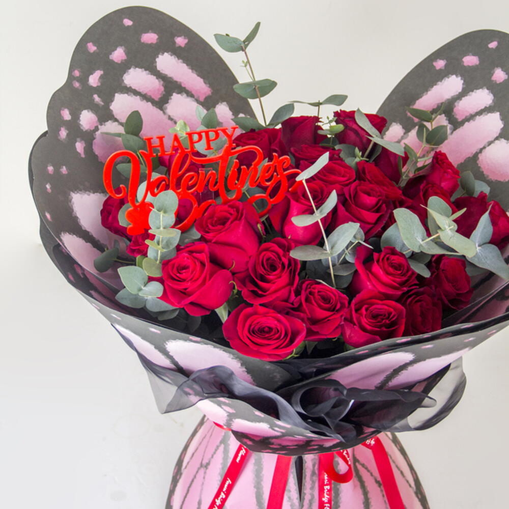 Spread your wings for love with this enchanting bouquet of red roses, wrapped in a beautiful butterfly design and topped with a sparkling Happy Valentines topper. A whimsical and romantic gift that will surely flutter hearts.