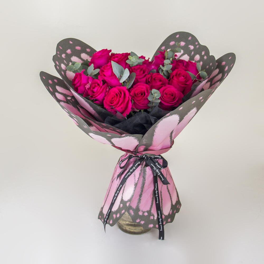 This exquisite bouquet features a dozen radiant red roses, artfully arranged and presented in a one-of-a-kind butterfly-inspired wrap.