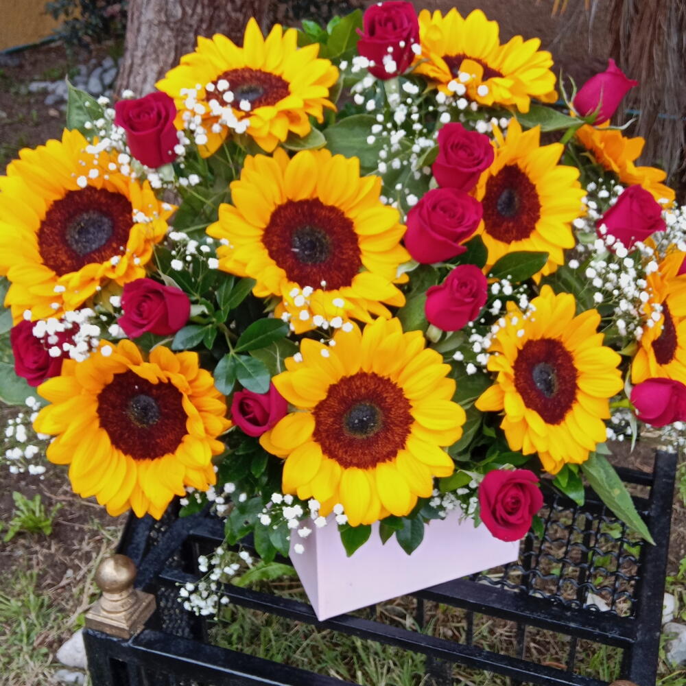 Caja de madera color rosa con 10 girasoles medianos , 20 rosas rojas y gipsophilia