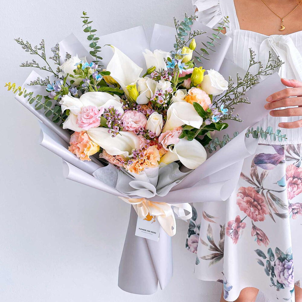 Looking for a gift that exudes elegance and sophistication? Look no further than the stunning Cala bouquet. This breathtaking arrangement features exquisite white calla lilies, expertly arranged with dainty wildflower and lush greens to create a truly luxurious gift. The Cala bouquet is the perfect choice for anyone who appreciates the finer things in life. Its pure white blooms are a symbol of purity, beauty, and elegance, making it the ideal gift for weddings, anniversaries, or any other special occasion. Whether it’s for a loved one or a colleague, this bouquet is sure to make a lasting impression. Contains: 5 Calla Lilies, 10 Ivory Roses, Lisianthus, Wax Flower, Oxypetalum Blue, Eucalyptus, Foliage *Due to seasonality, certain flower selections may be replaced with a similar looking flower of equal value. However, rest assured that colour themes and style will be in accordance with your choice.
