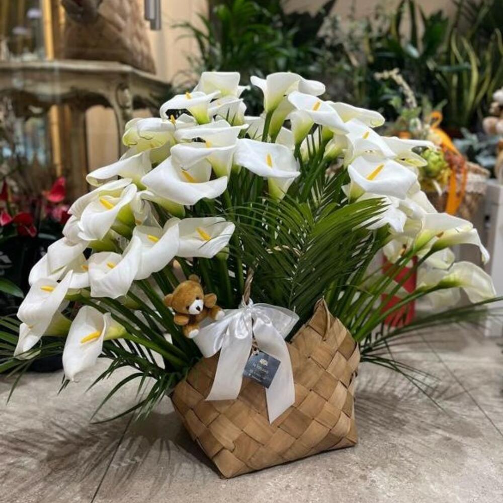 Satin ribbon - 1 pcs Teddy bear - 1 pcs calla lily - 51 pcs banana leaf basket - 1 pcs robellini palm leaf - 4 pcs