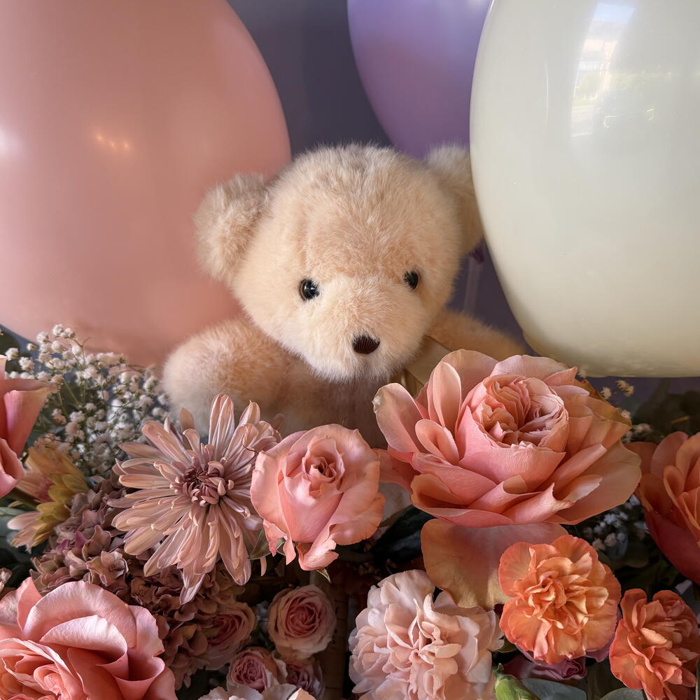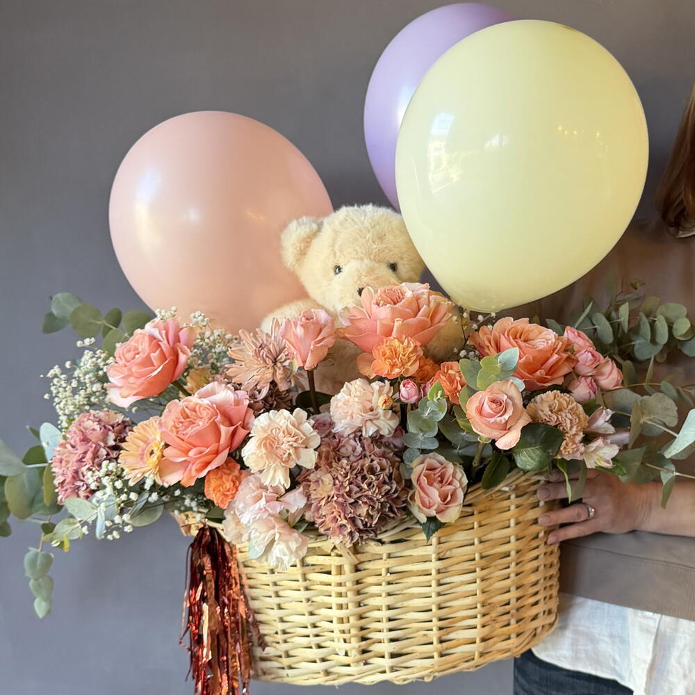 Canasto deluxe en tonos rosados con un mixto de flores de temporada, viene con globos y osito, ideal para cumpleaños, nacimiento, etc.