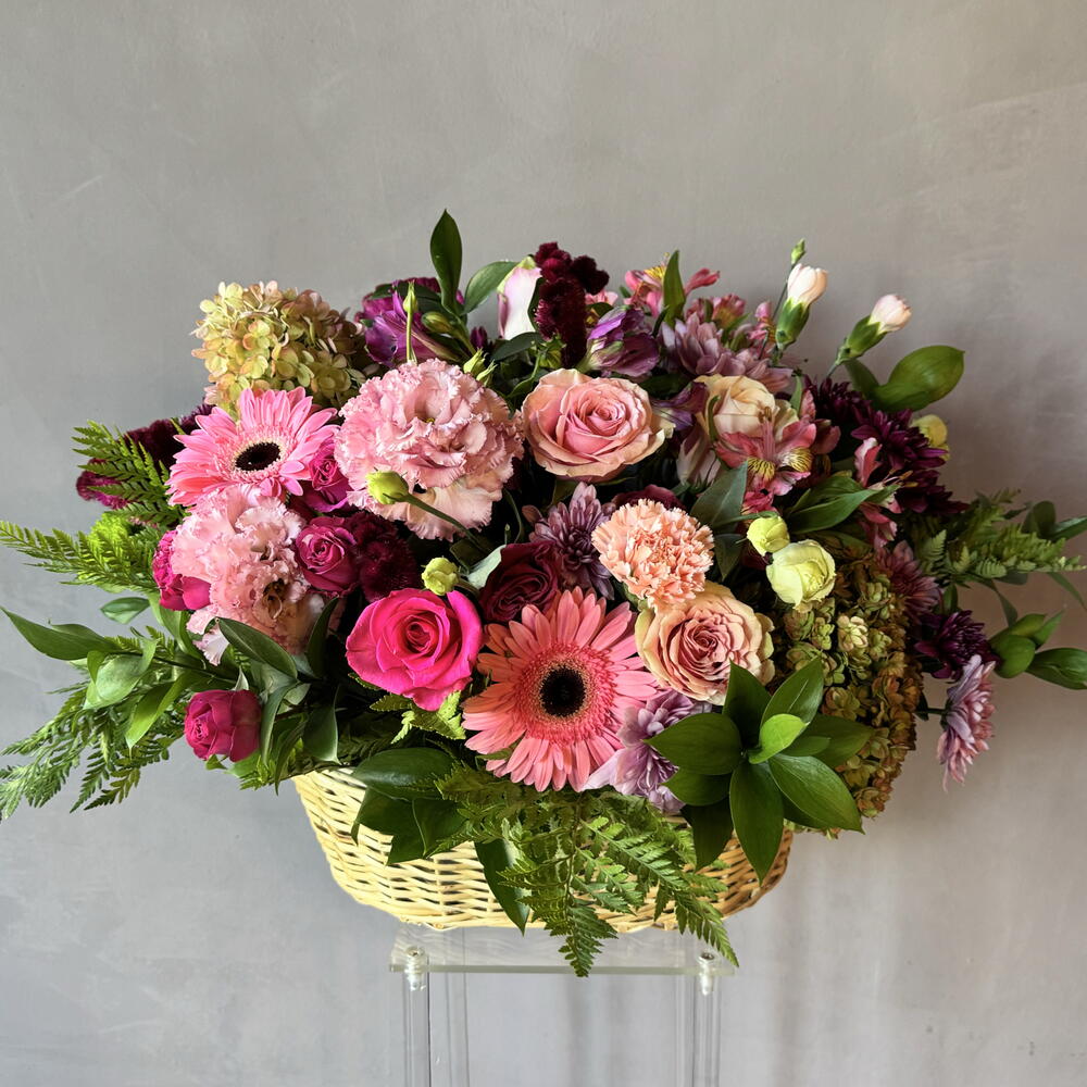 Canasto grande de flores surtidas en tonos fucsias más flores complementarias y follaje