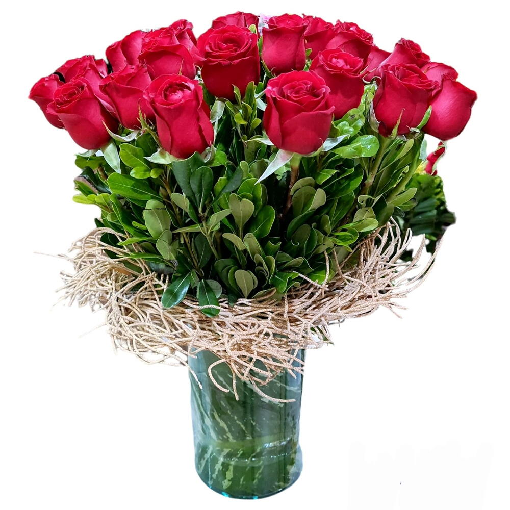 rosas rojas - 36 pcs florero de cristal - 1 pcs follaje - 10 pcs fibra de coco - 3 pcs
