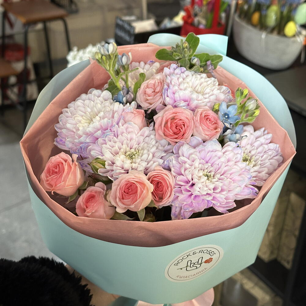 A magical, fairy-tale bouquet in the sweetest pastel colors! This "cotton candy" arrangement features lilac chrysanthemums, delicate pink spray roses, and charming blue floral accents. Wrapped in a trendy two-tone paper (mint and soft pink), it looks incredibly cute and stylish. The perfect gift for a young lady, a birthday, a baby shower, or just to make someone's day extra sweet. Tags: Pastel bouquet, Spray roses, Lilac chrysanthemums, Cotton candy flowers, Cute bouquet, Birthday flowers, New baby flowers, Fairy tale bouquet.