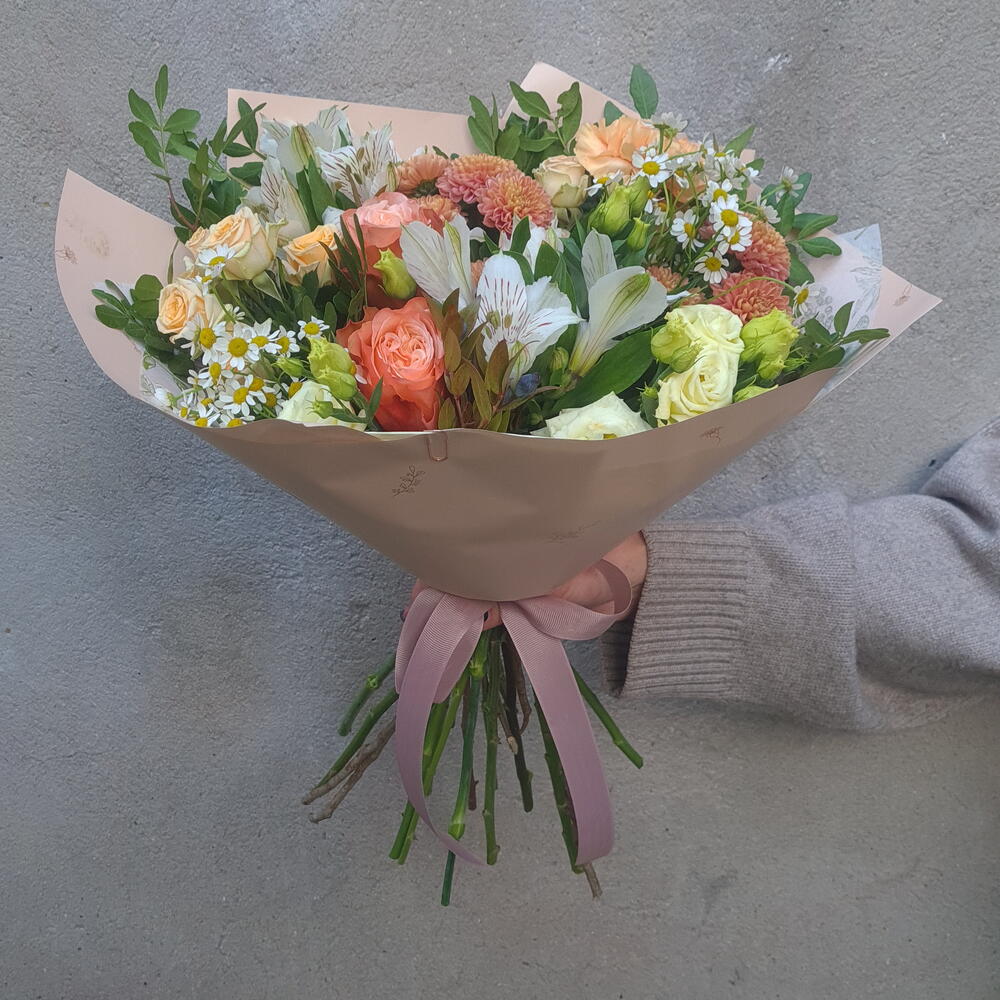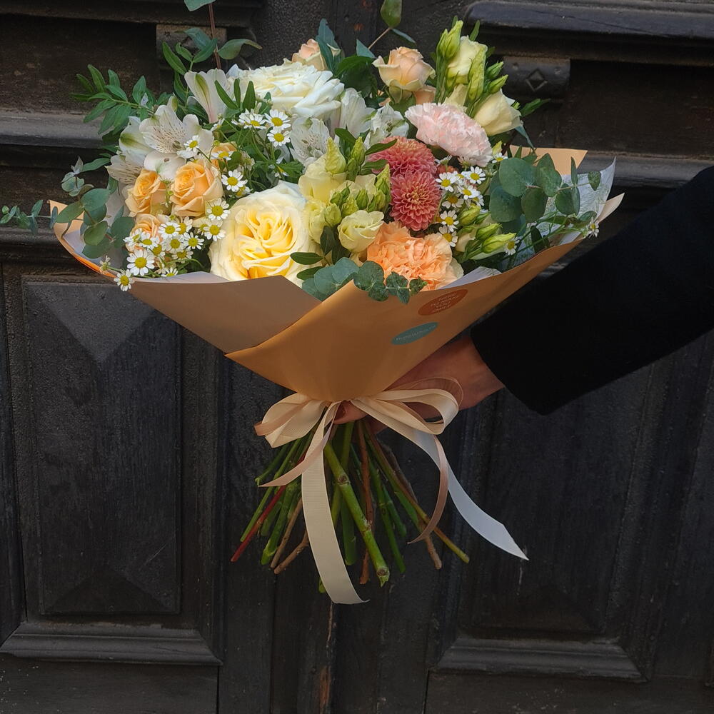 Bouquet in peach and neutral tones with fresh seasonal flowers. Elegant, modern and easy to match any interior. • Fresh flowers, daily selection • Same-day delivery in Belgrade • Photo confirmation before delivery • Carefully packed by our florist