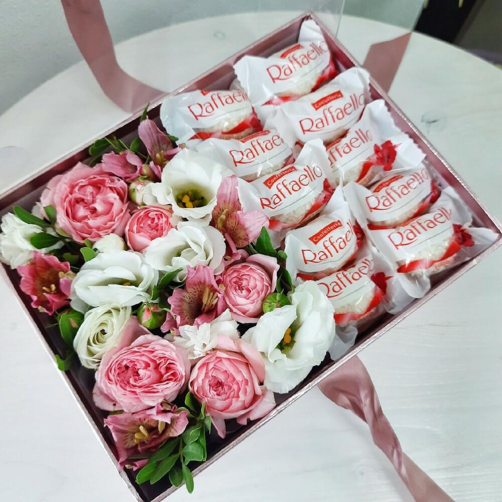 Satin ribbon - 1 pcs Eustoma - 2 pcs Greenery - 1 pcs Box - 1 pcs Alstroemeria - 1 pcs bush rose - 2 pcs floral oasis - 1 pcs raffaello 150 gr - 1 pcs