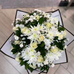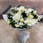 gypsophilia white - 20 pcs white roses - 10 pcs stems ruscus - 10 pcs white gebera - 10 pcs