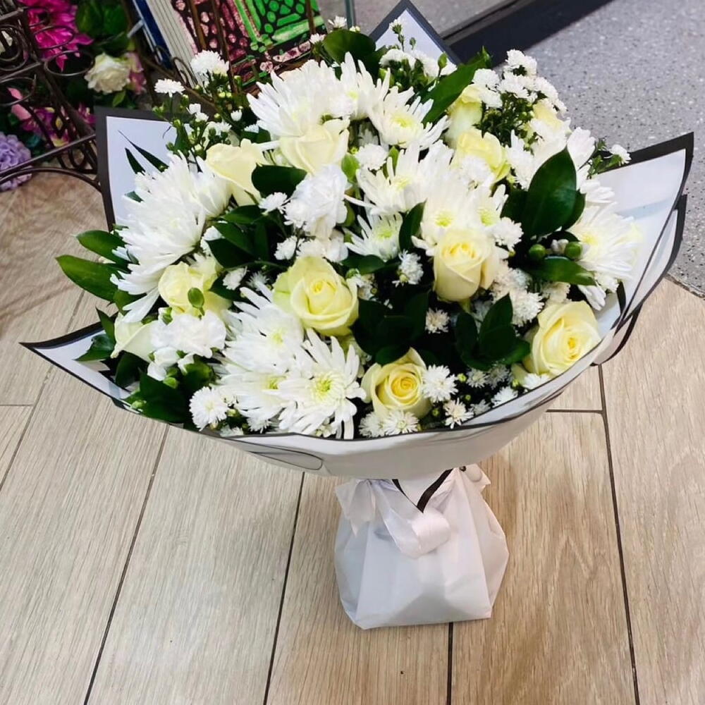 gypsophilia white - 20 pcs white roses - 10 pcs stems ruscus - 10 pcs white gebera - 10 pcs