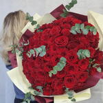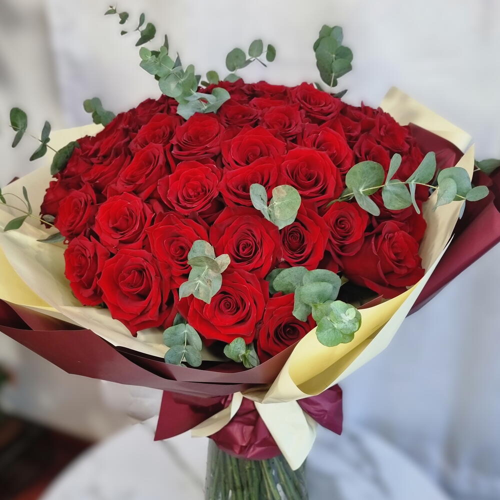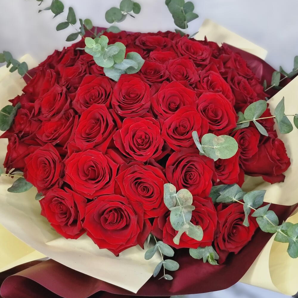 A classic bouquet of 75 fresh red roses complemented with light greenery and wrapped in elegant packaging. This timeless floral arrangement expresses love, admiration, and sincere emotions. Perfect for romantic occasions, anniversaries, birthdays, or meaningful gestures.