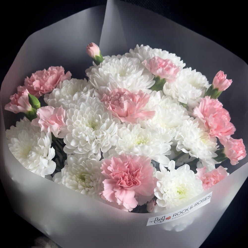 A stunning, long-lasting arrangement featuring fluffy white spray chrysanthemums paired with delicate pink carnations (dianthus). Wrapped in premium frosted packaging with a soft pink ribbon, this pastel bouquet is the perfect gift for Mother’s Day, a birthday, or a romantic gesture. Fresh, voluminous, and elegant.