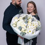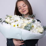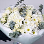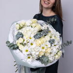 Eucalyptus - 8 pcs mondial rose - 9 pcs dianthuses white - 4 pcs hydrangeas white - 4 pcs daisy white - 5 pcs white spray roses - 5 pcs