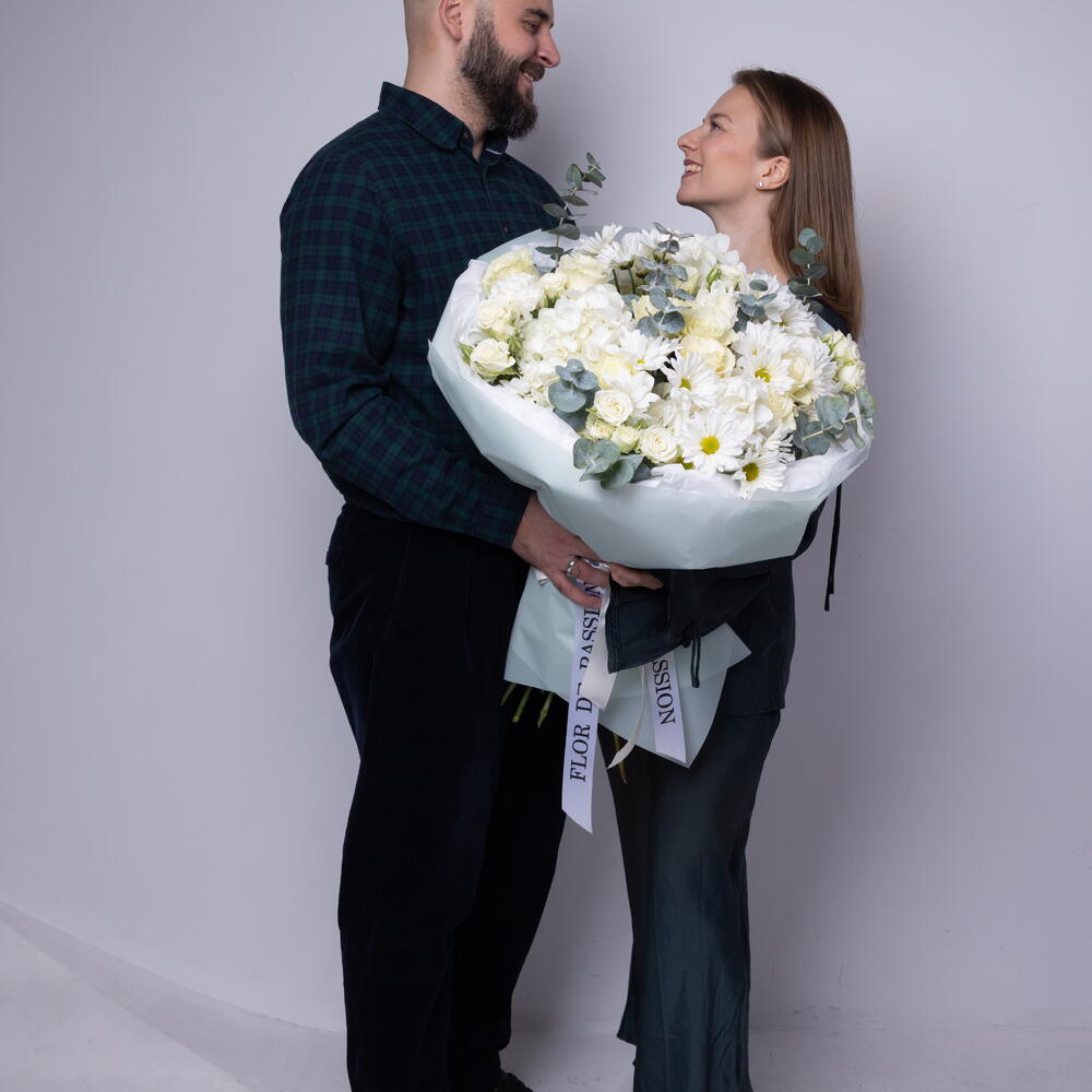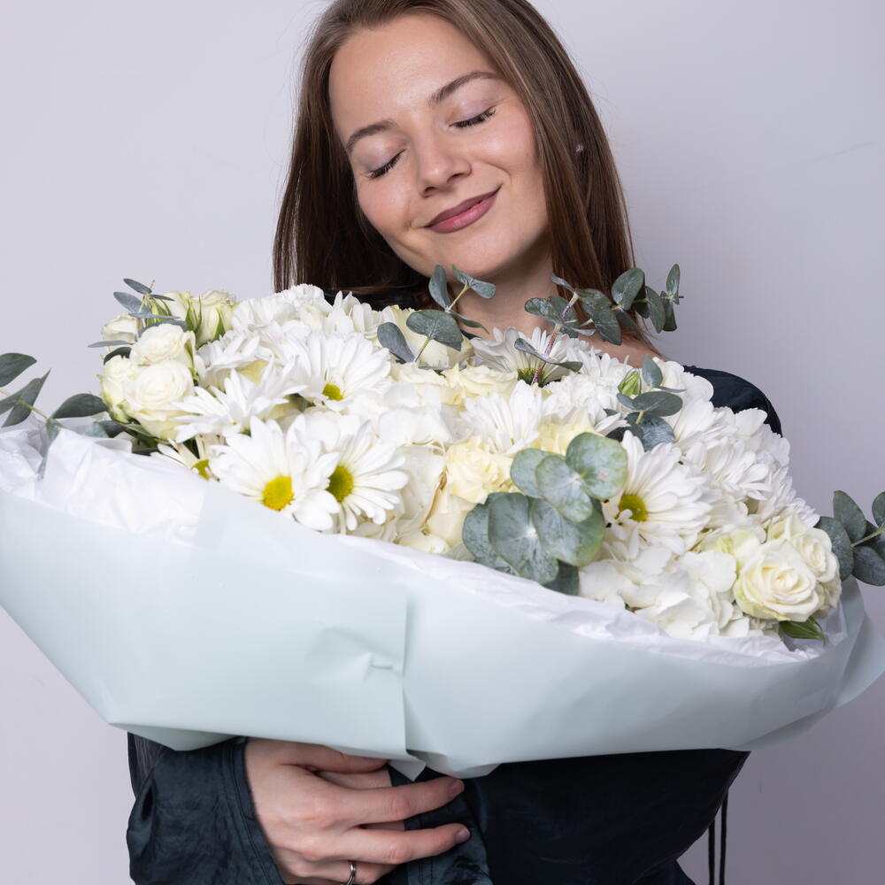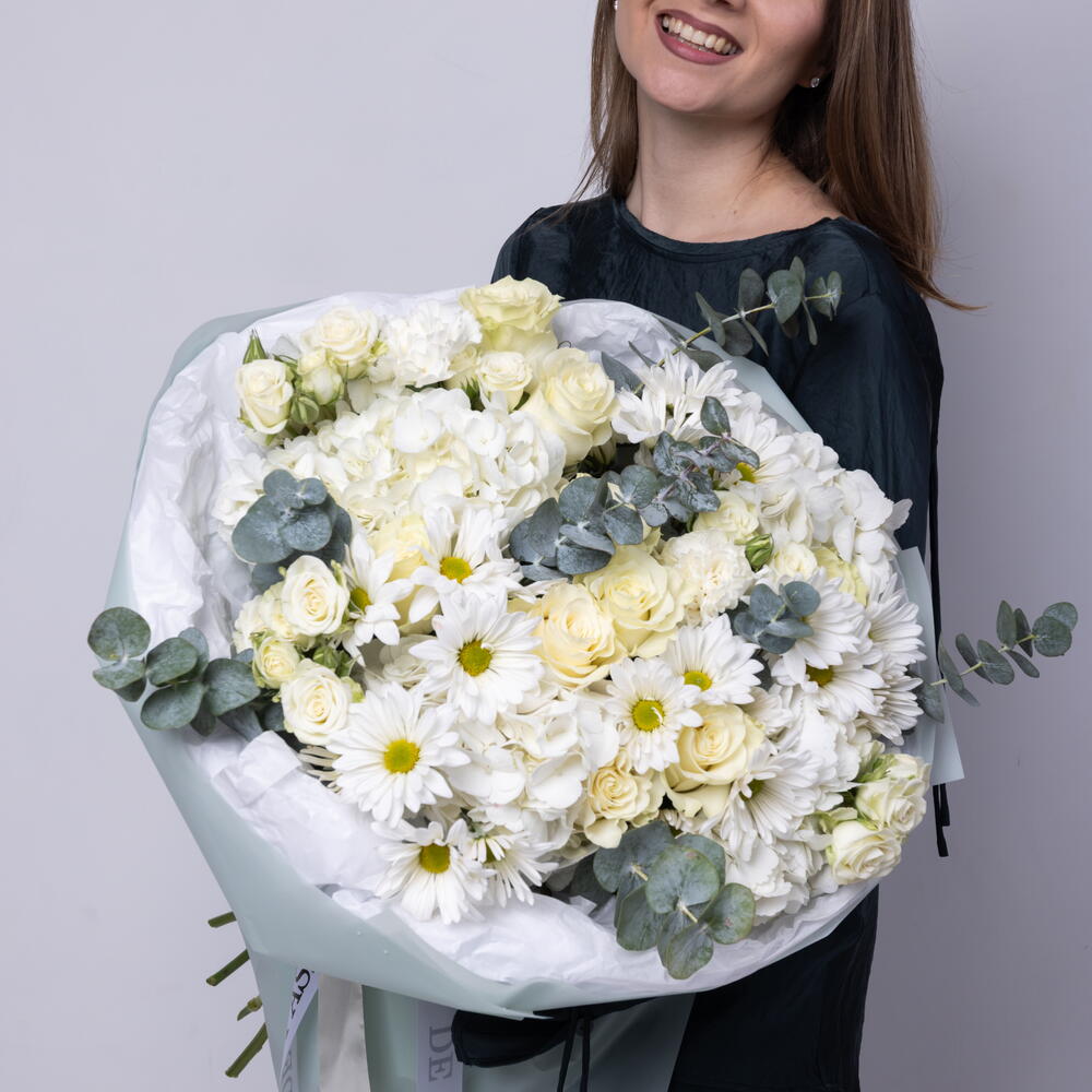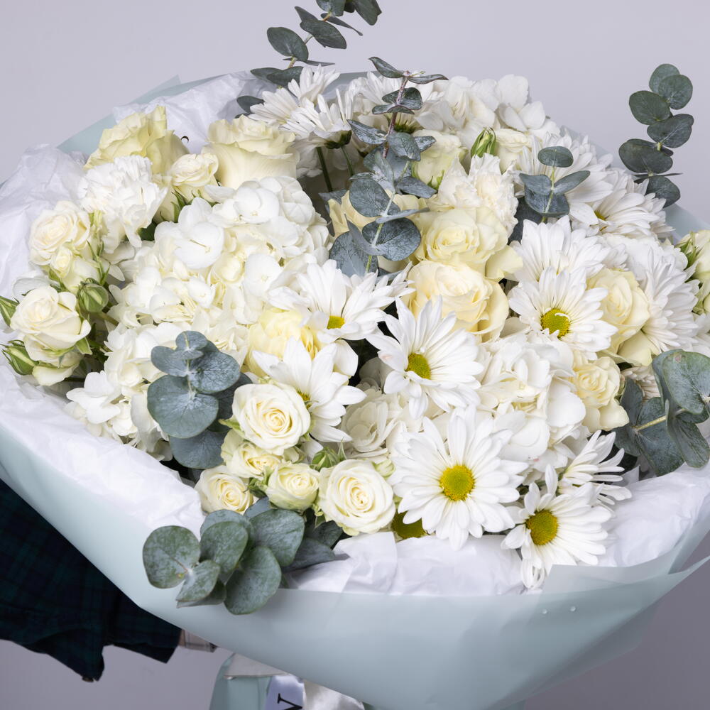 Eucalyptus - 8 pcs mondial rose - 9 pcs dianthuses white - 4 pcs hydrangeas white - 4 pcs daisy white - 5 pcs white spray roses - 5 pcs