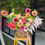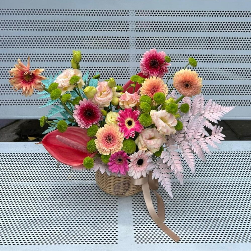 Basket - 1 pcs Aster - 6 pcs Gerbera - 9 pcs Lisianthus - 4 pcs leather leaf - 3 pcs
