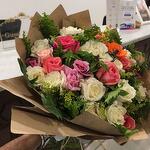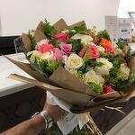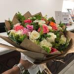 A beautiful bouquet of 25 colorful Roses with greenery and designer wrapping.