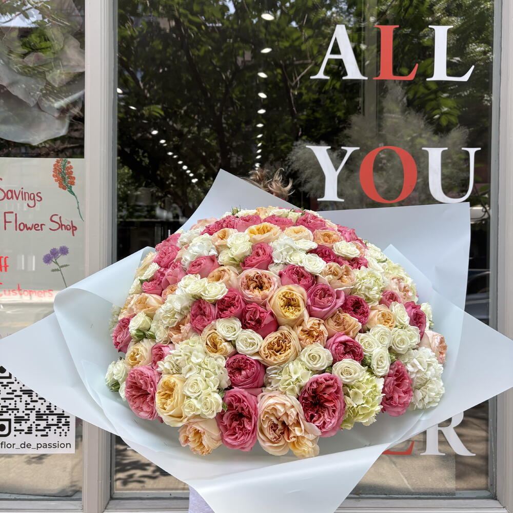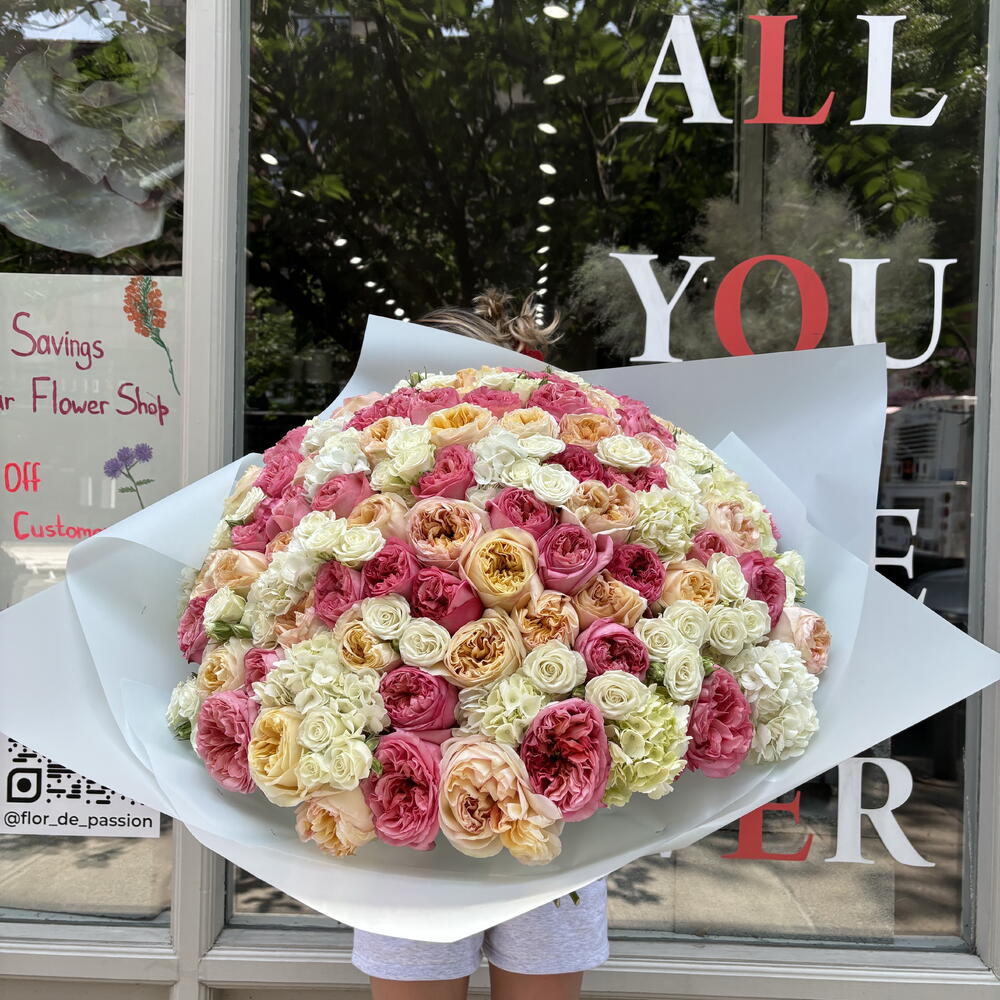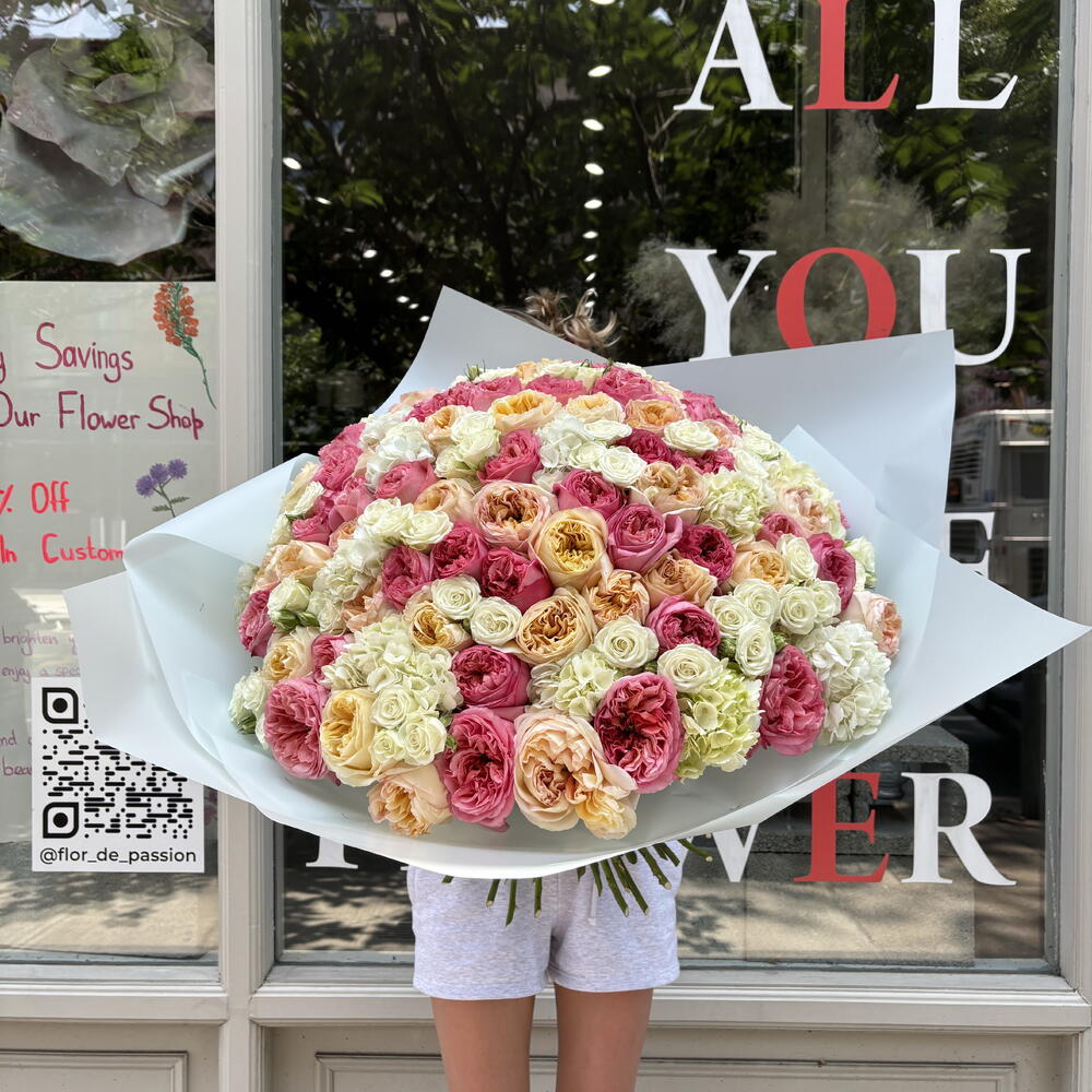 Indulge in the beauty of our Confession Bouquet. Featuring a stunning combination of pink expression garden roses and cream expression , white hydrangeas, and white spray roses, this amazing huge bouquet is sure to make a statement. Each flower is carefully selected and arranged to create a breathtaking arrangement that will brighten up any room. Perfect for any occasion, this bouquet is a must-have for flower lovers and connoisseurs alike. HOW TO CARE OF FLOWERS? Do not remove the wrapping paper from the bouquet, so then flowers will live longer Change the cold water in a vase every day Keep the vase clean Cut the stem of each flower every two days Keep the bouquet out of a direct sun, drafts and heaters Add the flower food 2-3 days after you’ve bought your bouquet (We add the flower food to every bouquet)