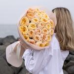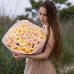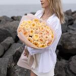 Букет красивый получился. Доставили немного позже назначенного времени, не критично для нас это было. Фото отчет сделали быстро. Доставка считаю дорогая, плюс большие розы не первой свежести были.