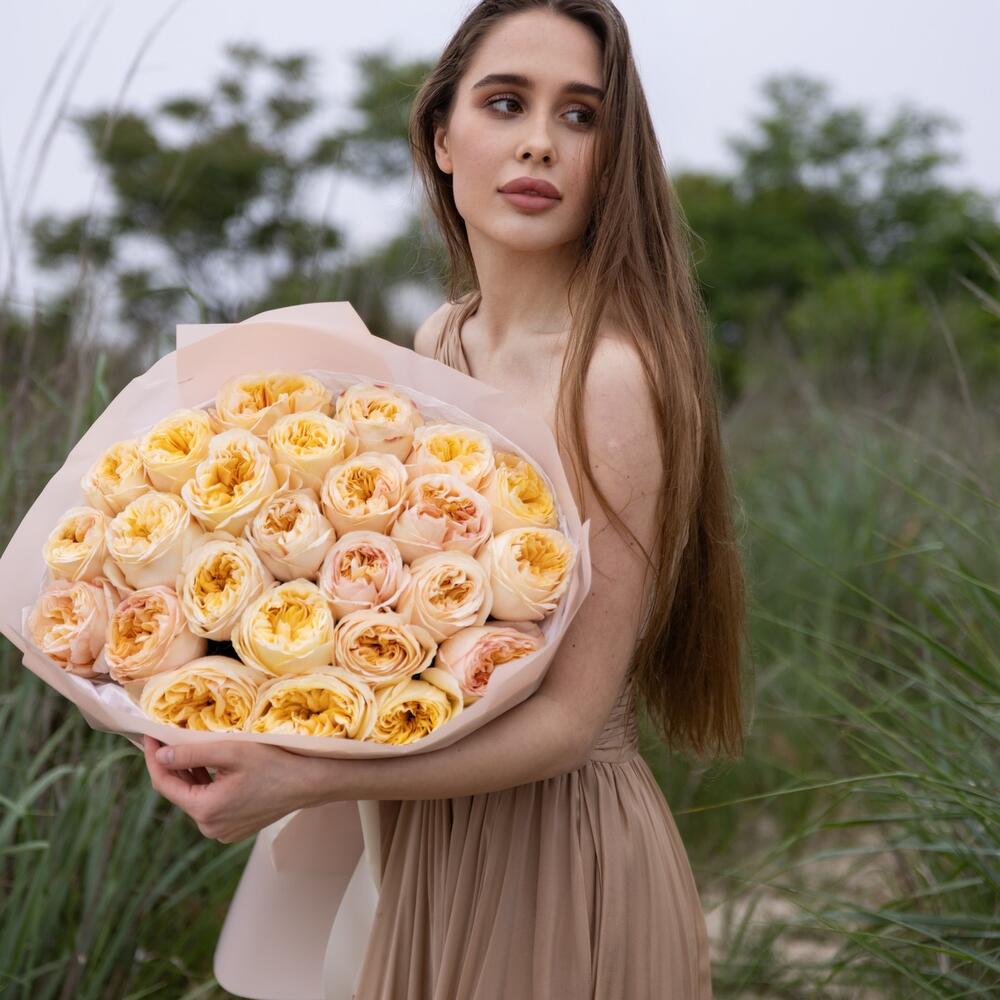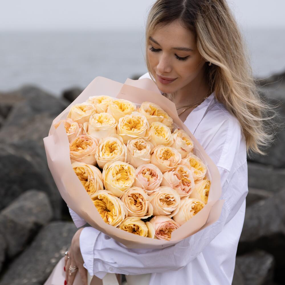 Experience the beauty of Cream Expression Garden Roses with this stunning bouquet. Each peony rose has been carefully selected to create a mesmerizing display of soft cream tones. Perfect for special occasions or as an elegant addition to any room.