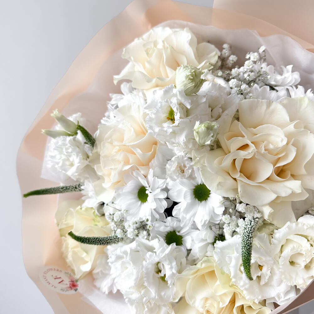 Veronica - 5 pcs Eustoma - 3 pcs white gypsophila - 1 pcs french rose white - 5 pcs chris - 3 pcs
