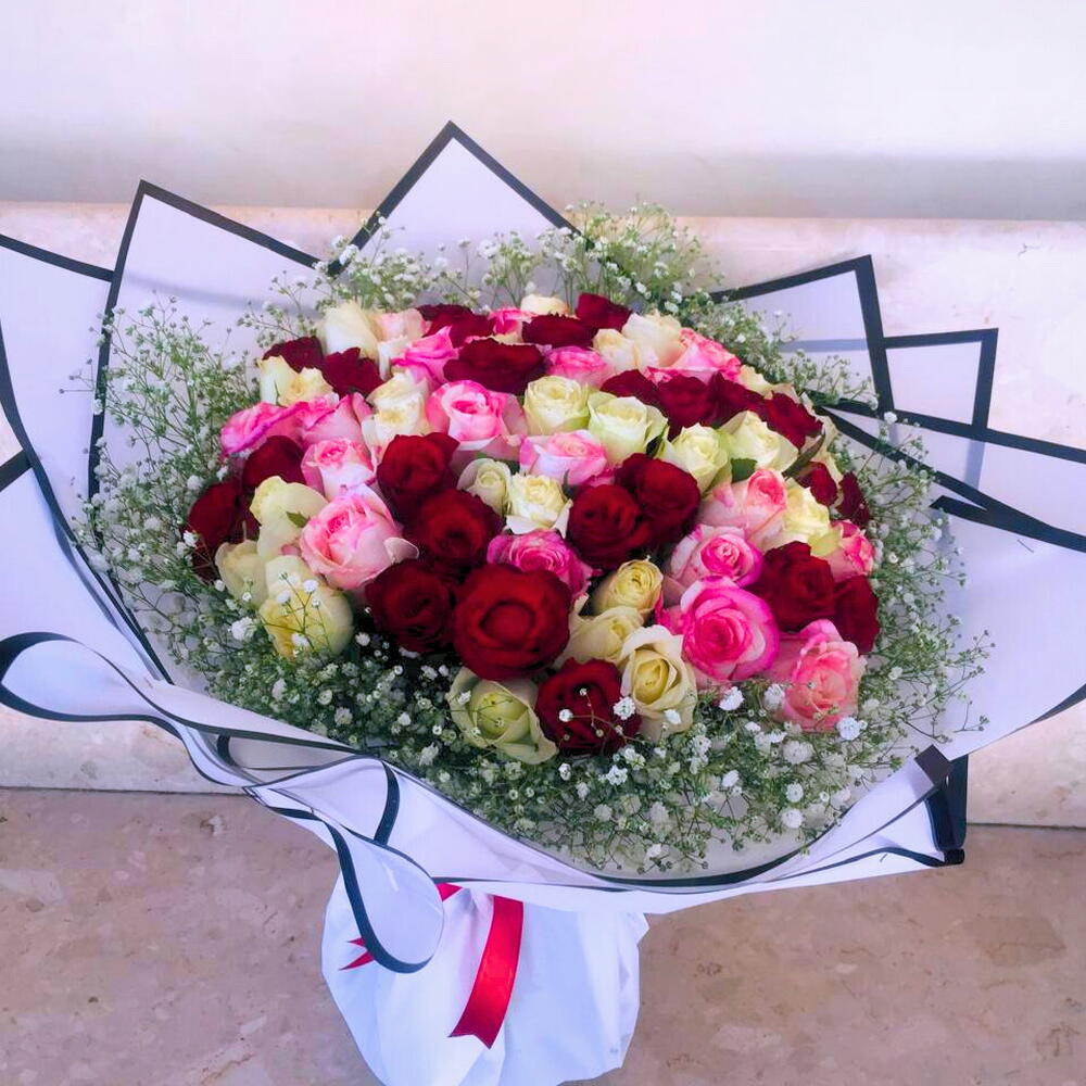 gypsophila white - 1 pcs red roses - 20 pcs pink roses - 20 pcs white roses - 20 pcs