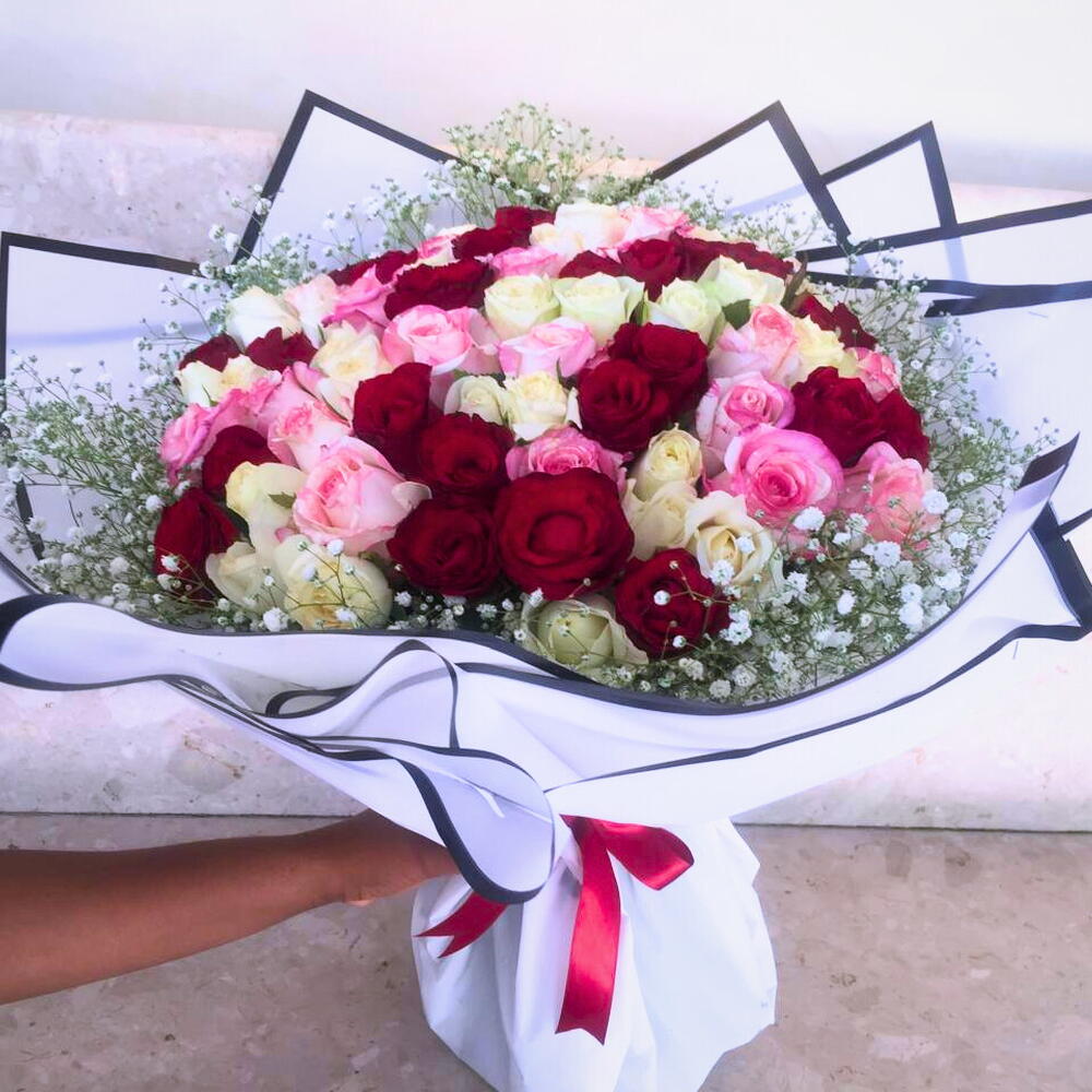 A perfect harmony of passion and purity, Crimson Allure is a breathtaking bouquet that combines vibrant red, soft pink, rich red and pure white roses. Wrapped in elegant white paper, this timeless arrangement speaks of love’s many dimensions.
