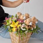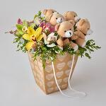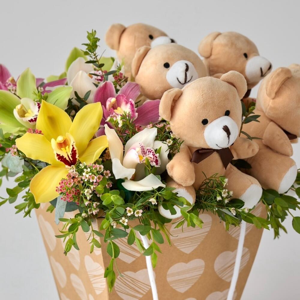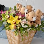 Eucaliptus - 2 pcs cymbidium - 7 pcs chamelacium - 2 pcs bag - 1 pcs taddy bear - 5 pcs