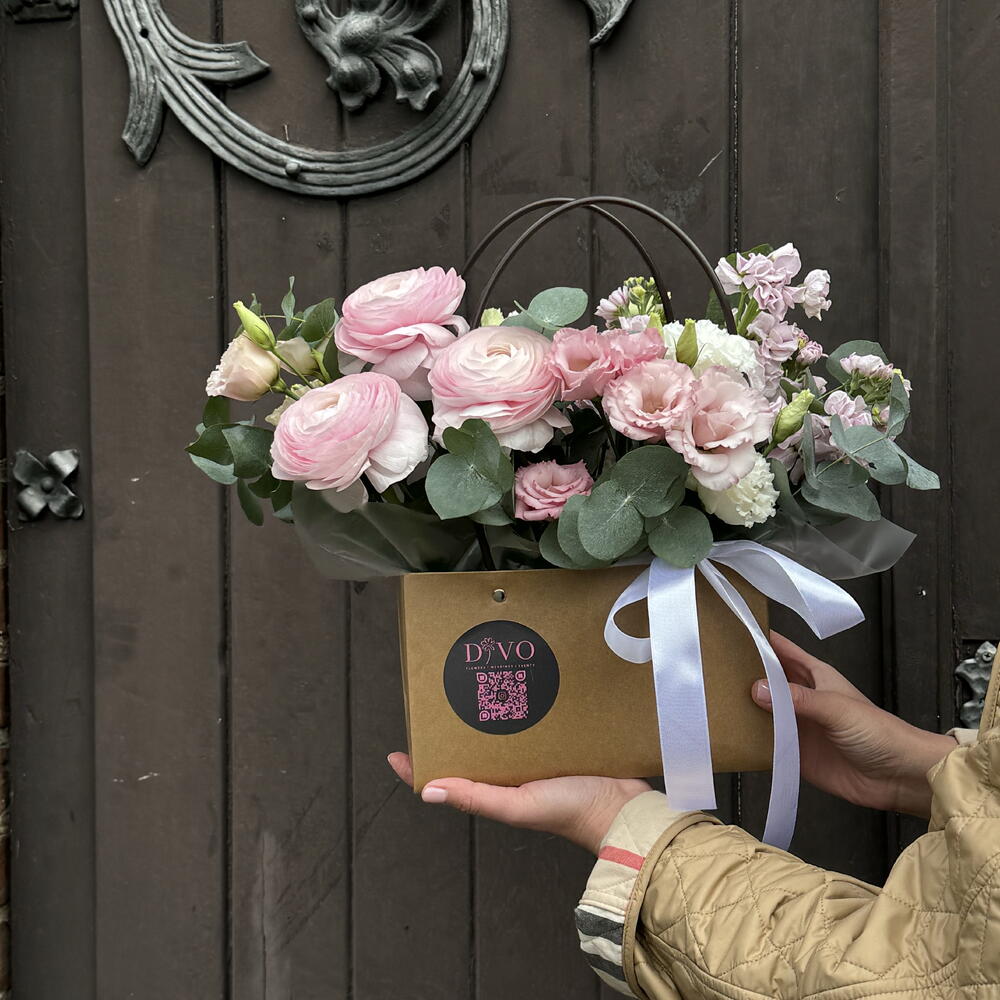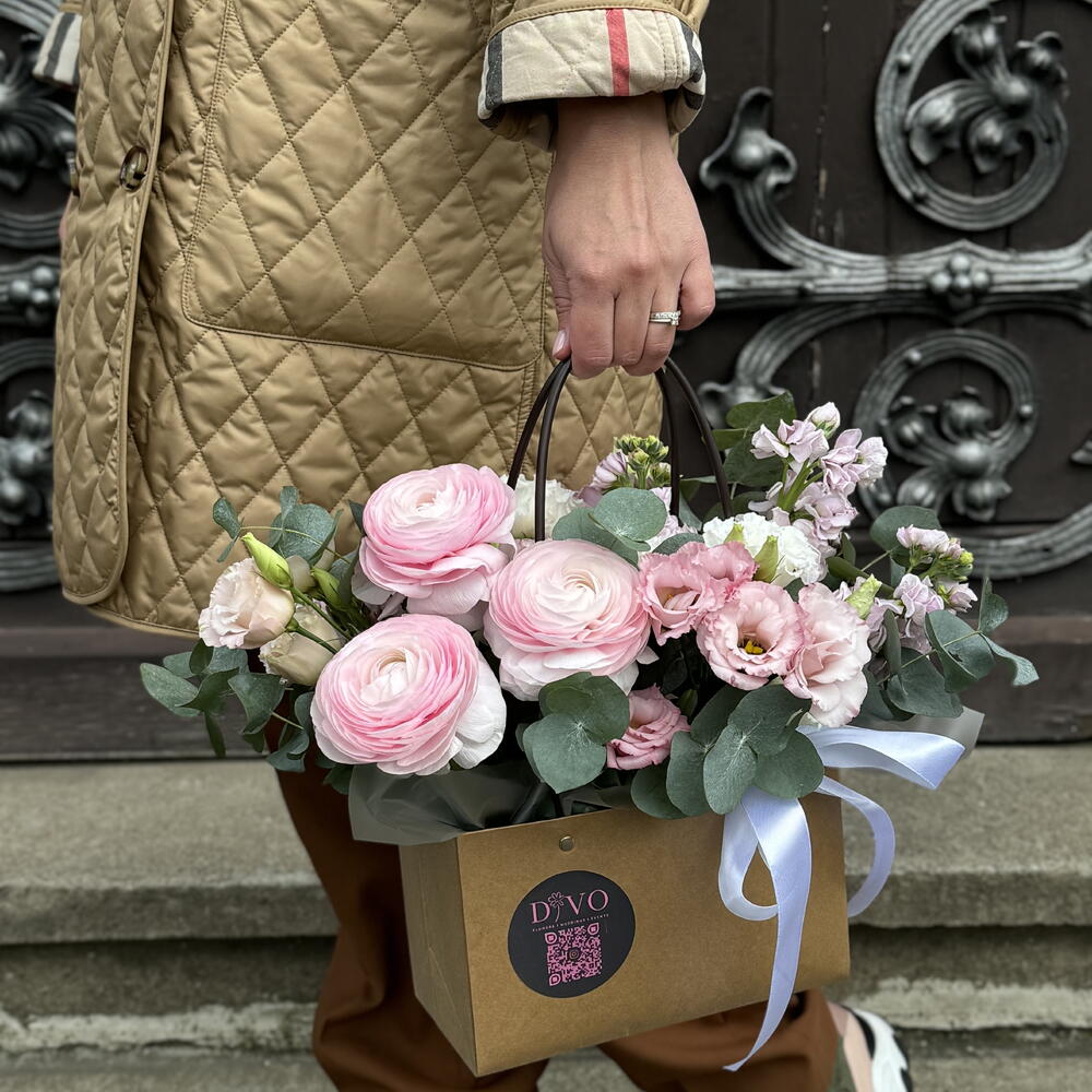 Satin ribbon - 1 pcs Eustoma - 6 pcs Eucalyptus - 5 pcs ranunculus - 10 pcs a card with your wishes - 1 pcs cardboard handbag - 1 pcs