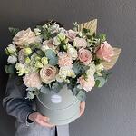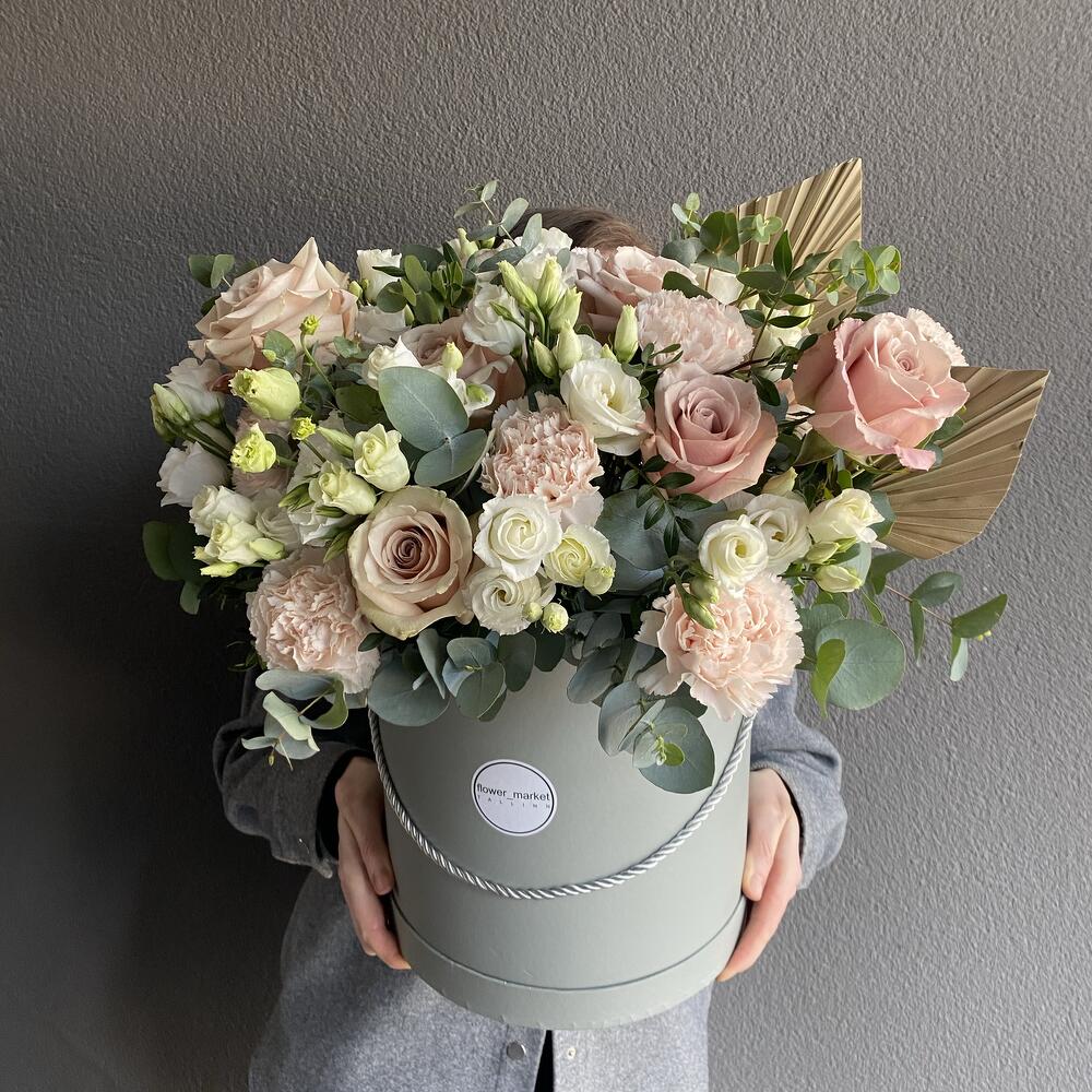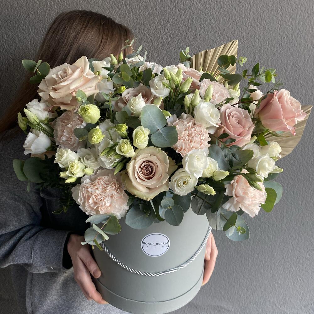 Eustoma - 6 pcs dianthus - 6 pcs eucalyptus - 6 pcs roos - 7 pcs palm leaves - 2 pcs