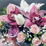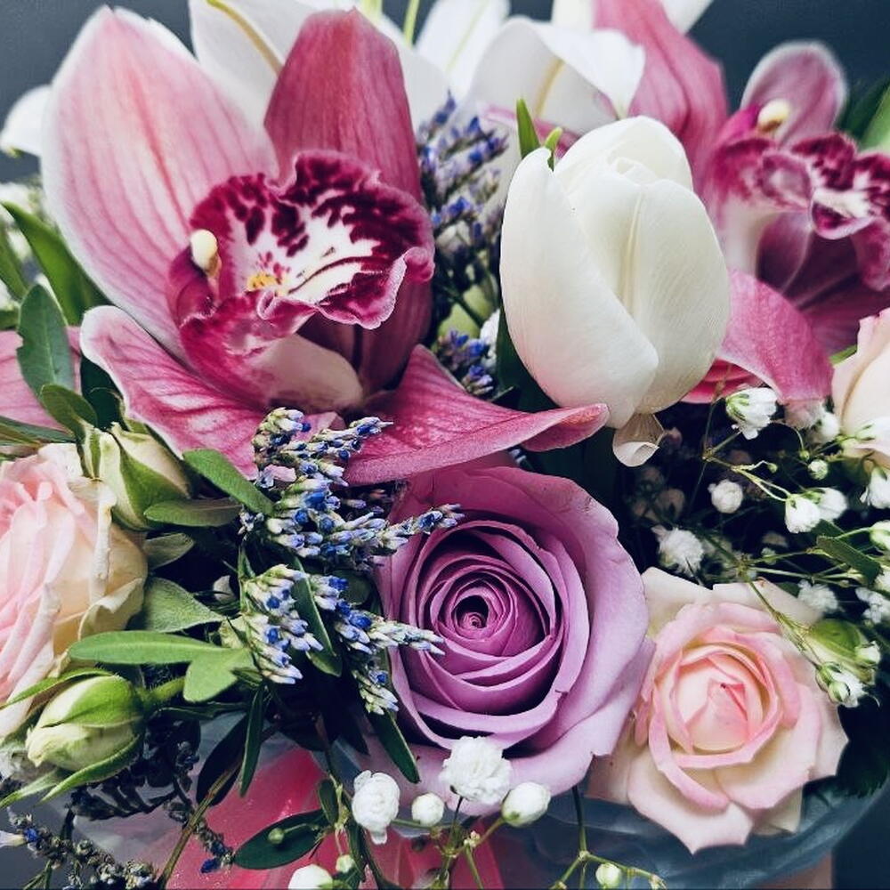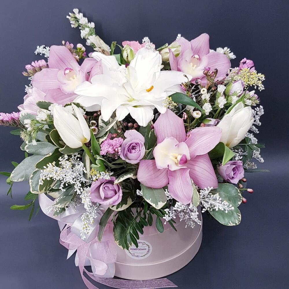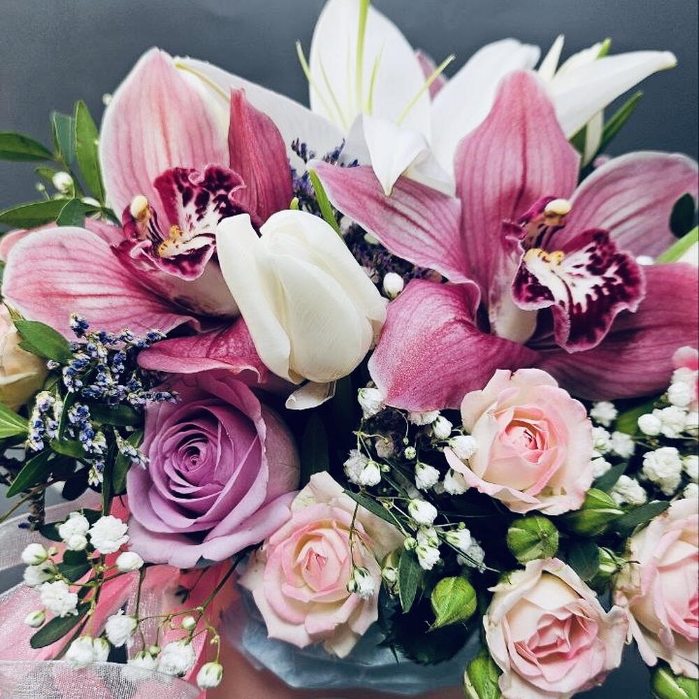 Greenery - 7 pcs Lilies - 1 pcs orchids - 3 pcs roses - 7 pcs hat box with ribbons and oasis - 1 pcs sticker lets never quarrel - 1 pcs