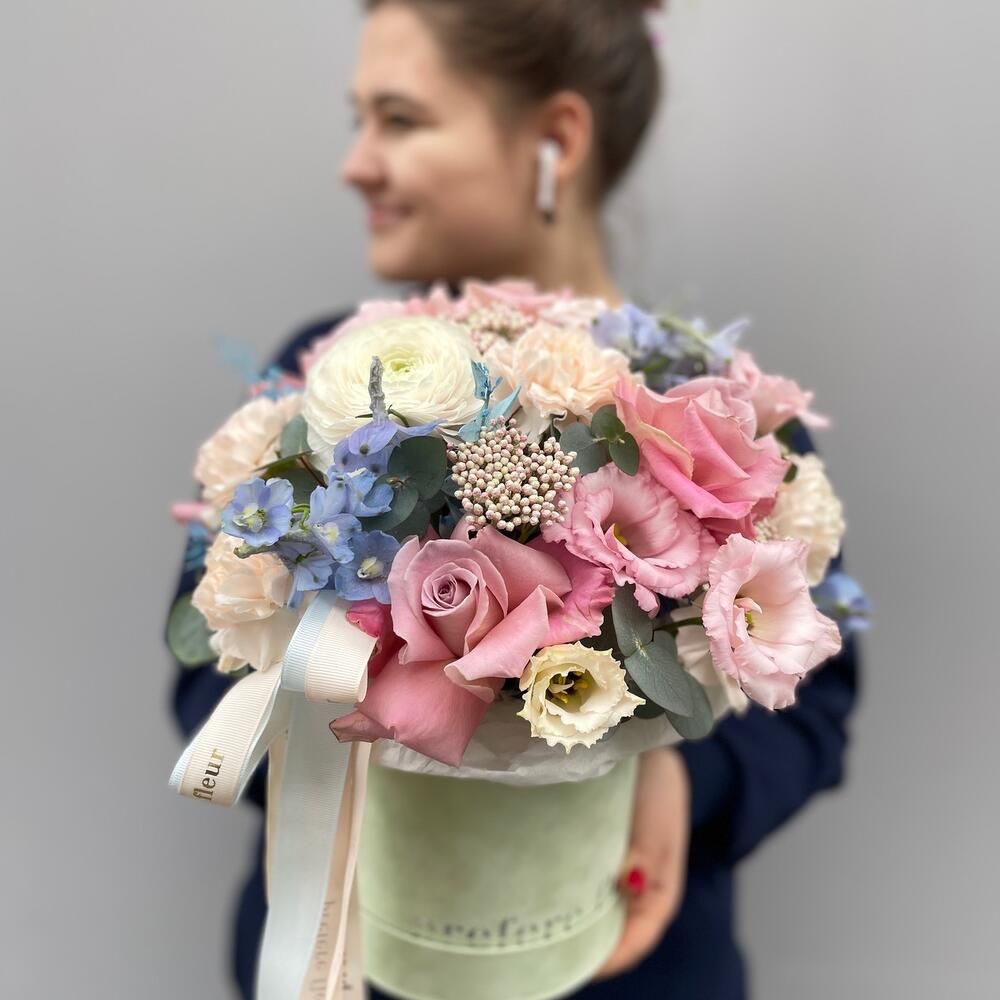 Eustoma - 2 pcs Eucalyptus - 4 pcs dianthus - 5 pcs delphinium - 4 pcs rice flowers - 2 pcs roses - 7 pcs