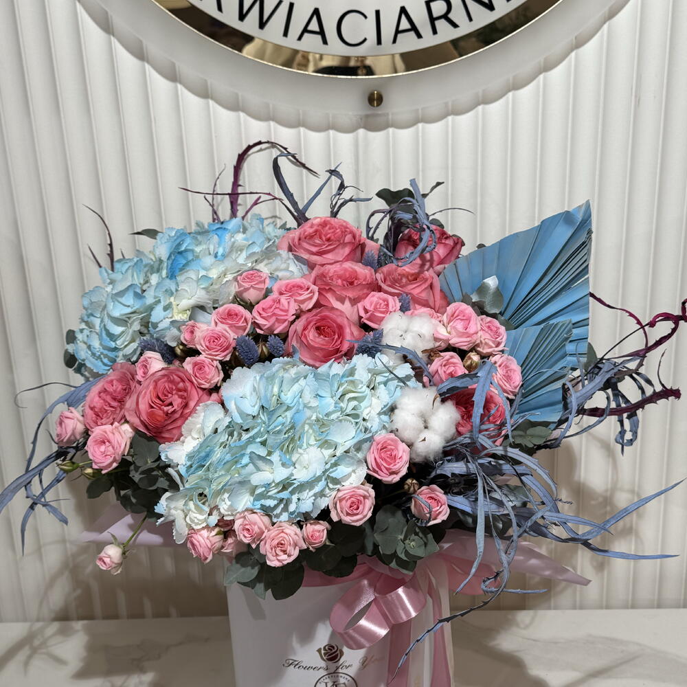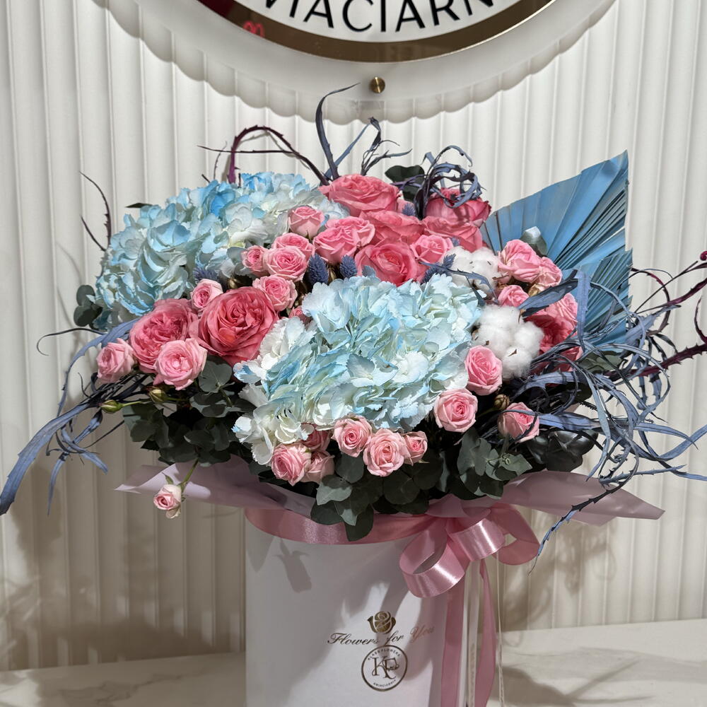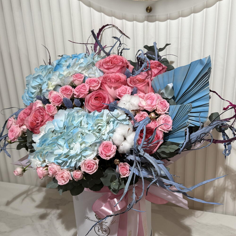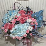 rose - 9 pcs hydrangea - 2 pcs eucalyptus - 5 pcs spray rose - 9 pcs dried grasses - 10 pcs