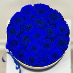 A round box filled with 19 rich, deep blue roses — a striking and elegant arrangement that makes a bold statement. Real roses that have been carefully treated to maintain their fresh look for months or even years. These everlasting blooms are perfect for expressing timeless love, passion, and elegance. No watering or maintenance required — just lasting beauty.