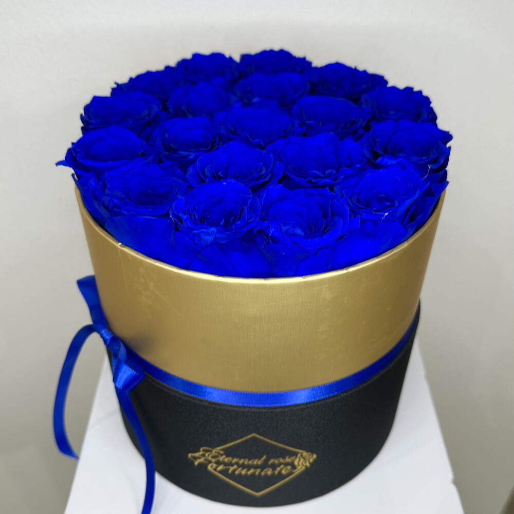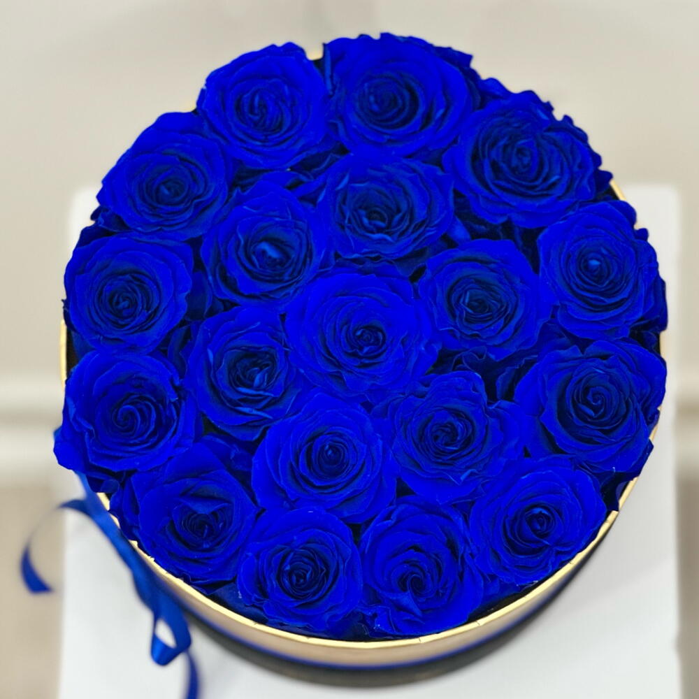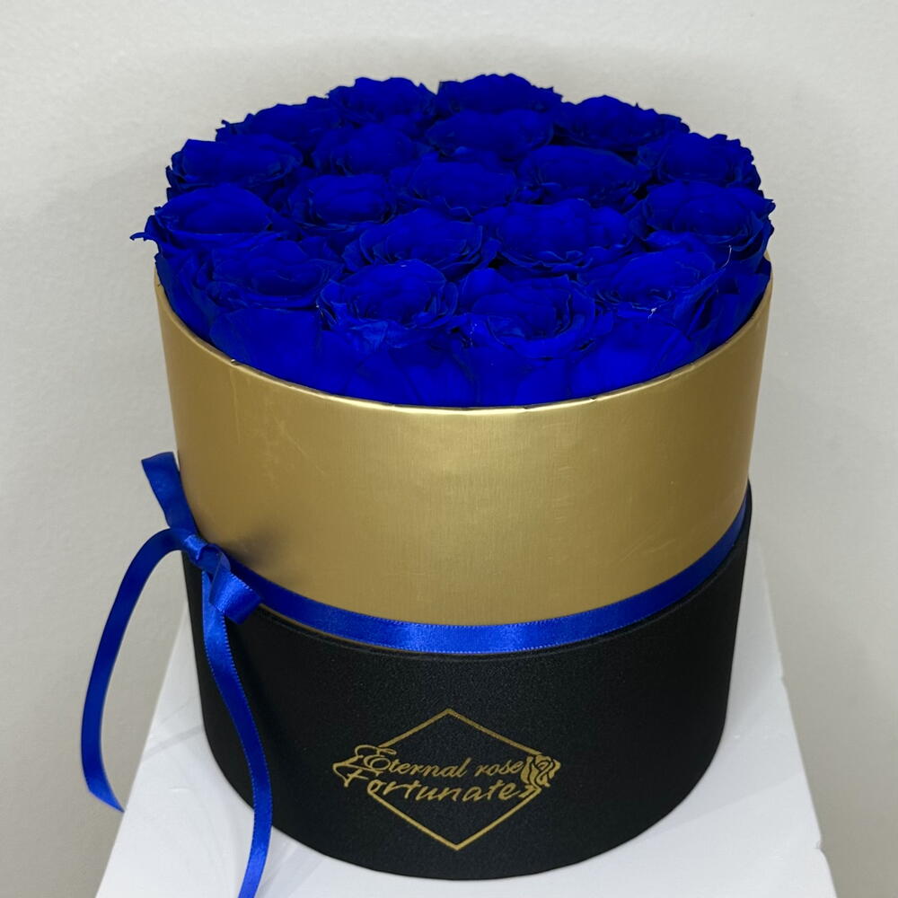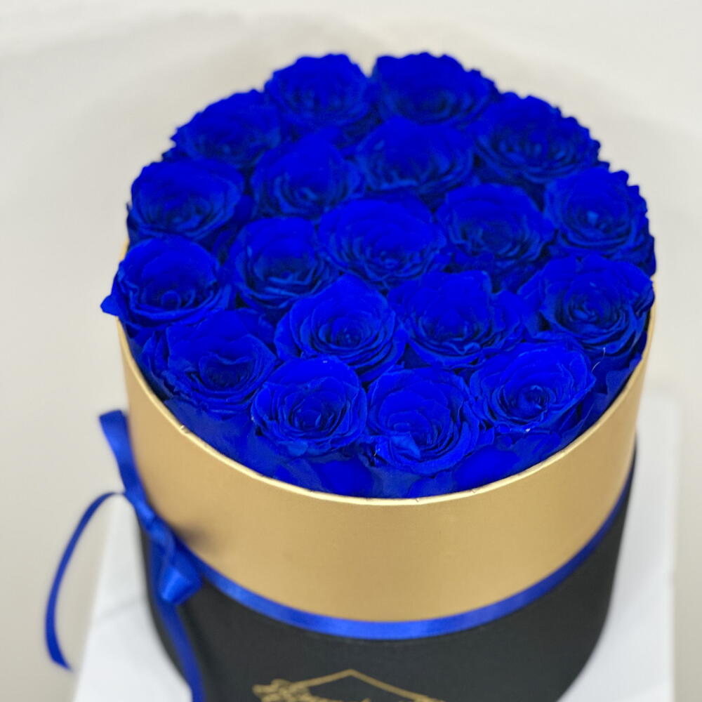 A round box filled with 19 rich, deep blue roses — a striking and elegant arrangement that makes a bold statement. Real roses that have been carefully treated to maintain their fresh look for months or even years. These everlasting blooms are perfect for expressing timeless love, passion, and elegance. No watering or maintenance required — just lasting beauty.