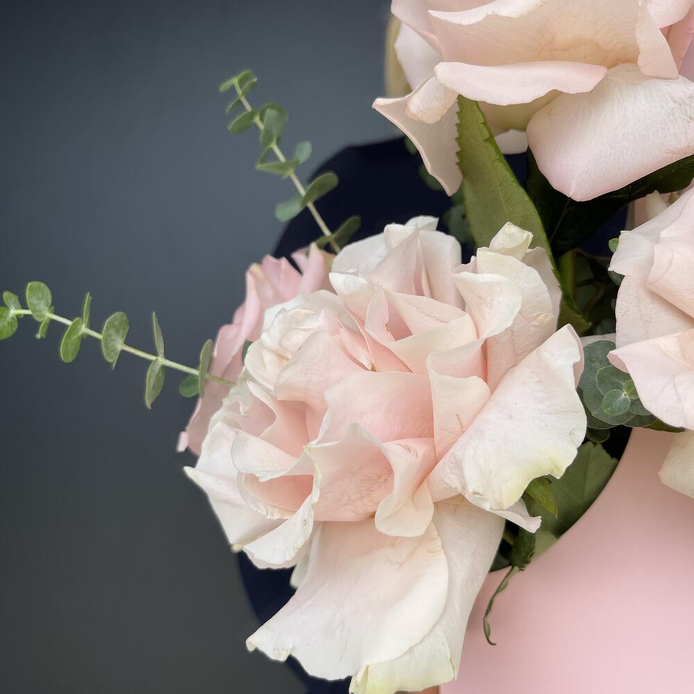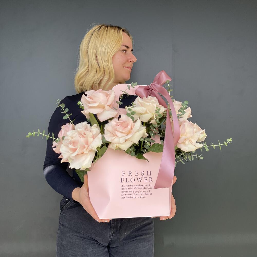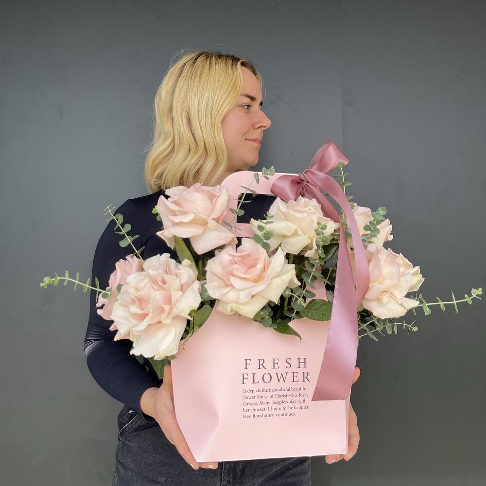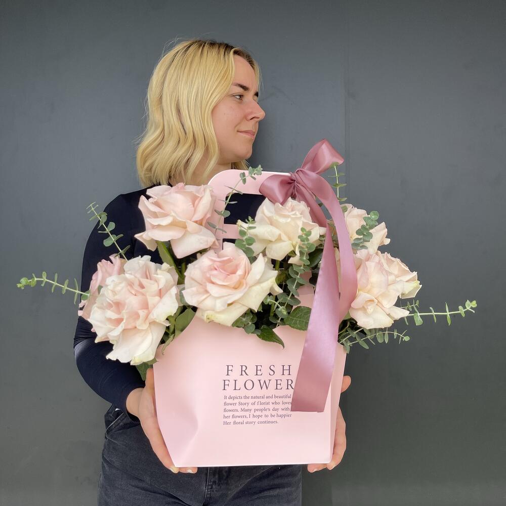 Eucalyptus - 2 pcs ribbon satin - 1 pcs sponge floral - 1 pcs paper bag - 1 pcs roses pink - 7 pcs